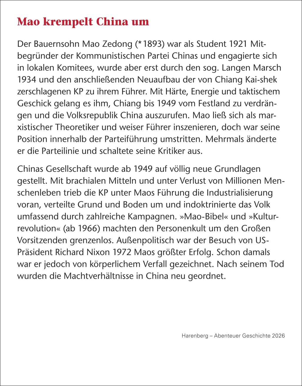 • Große Ereignisse und vergessene Episoden, außergewöhnliche Persönlichkeiten und folgenschwere Entscheidungen: Kalender zum Aufstellen mit über 300 historischen Momenten, herausfordernden Quizfragen und Bildern von außergewöhnlichen Ereignissen
