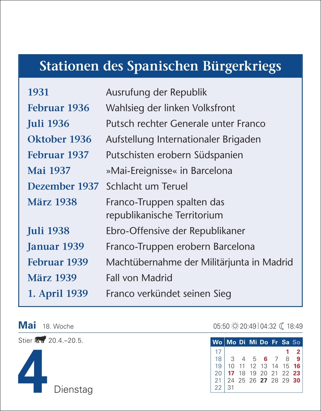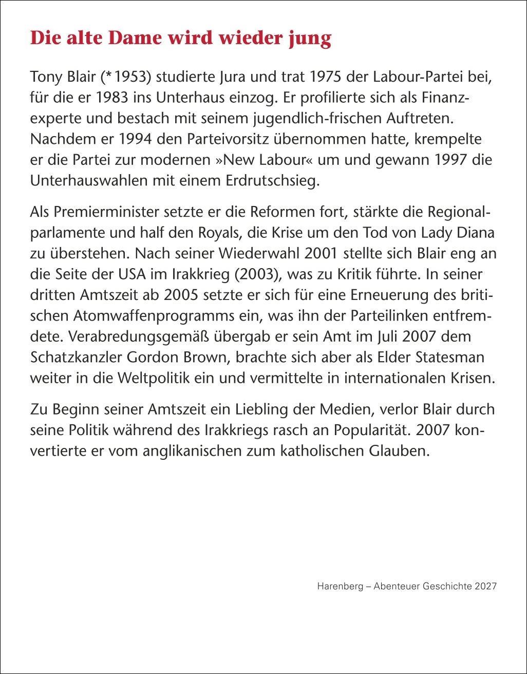 - Große Ereignisse und vergessene Episoden, außergewöhnliche Persönlichkeiten und folgenschwere Entscheidungen: Kalender zum Aufstellen mit über 300 historischen Momenten, herausfordernden Quizfragen und Bildern von außergewöhnlichen Ereignissen