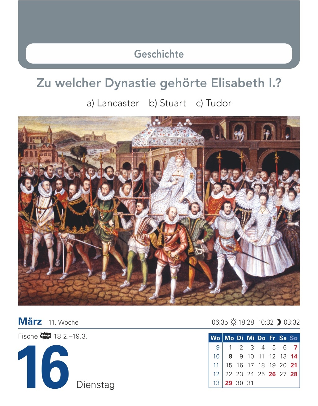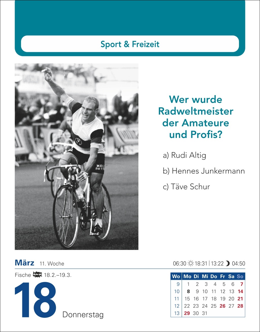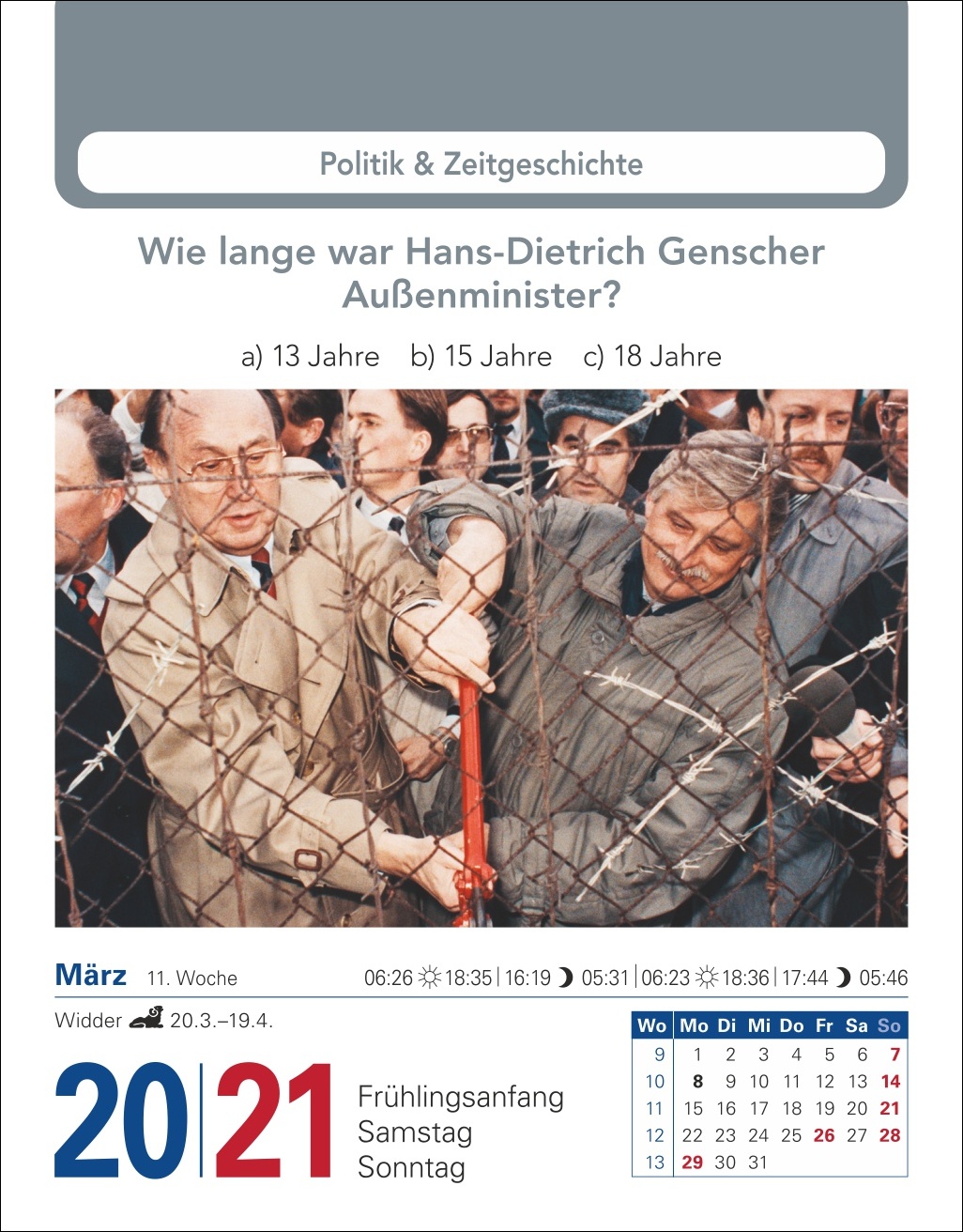 - Tagtäglich neuen Fakten auf die Spur kommen: Tischkalender mit über 300 Quizfragen aus den breiten Themenbereichen Politik und Zeitgeschichte, Gesellschaft, Wissenschaft, Kultur, Sport und Freizeit