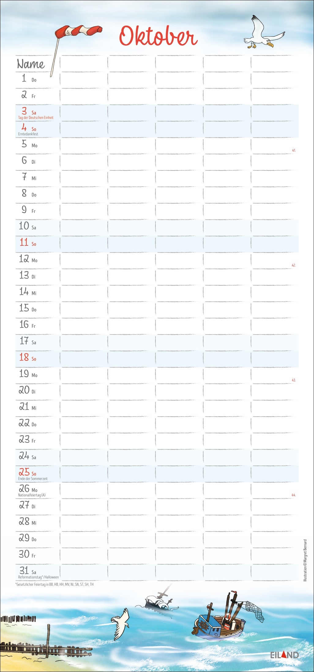 Thematisch auf die norddeutsche Waterkant ausgerichtet, bietet dieser beliebte bunte Eiland-Familienplaner in fünf Spalten den Platz für die terminliche Organisation eines bis zu fünfköpfigen Haushalts. Margret Bernards bunte Bildergeschichten begleiten unterhaltsam die monatlichen Eintragungen von ‚Vaddern‘, ‚Muddern‘ und von die ‚Kinners’…