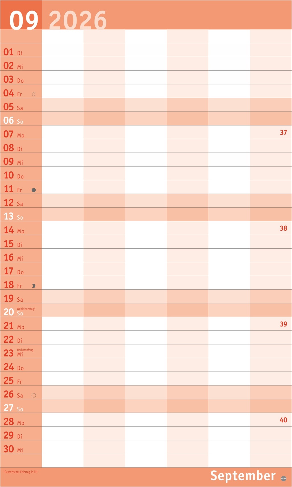 Klassischer, farbenfroher Planer für die Großfamilie. Sehr übersichtlich mit 6 Spalten und mit viel Platz für Eintragungen. Mit Schulferien und 3-Monatsvorschau aufs Folgejahr.