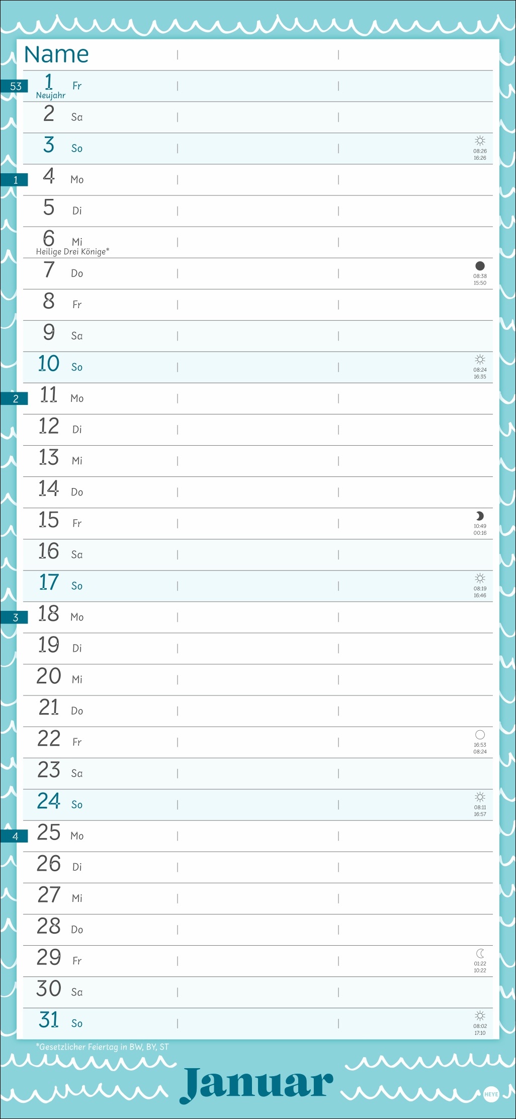 - Macht sich dünn: Für den länglichen Kalender im Format 16 x 34,7 cm findet sich immer ein Plätzchen