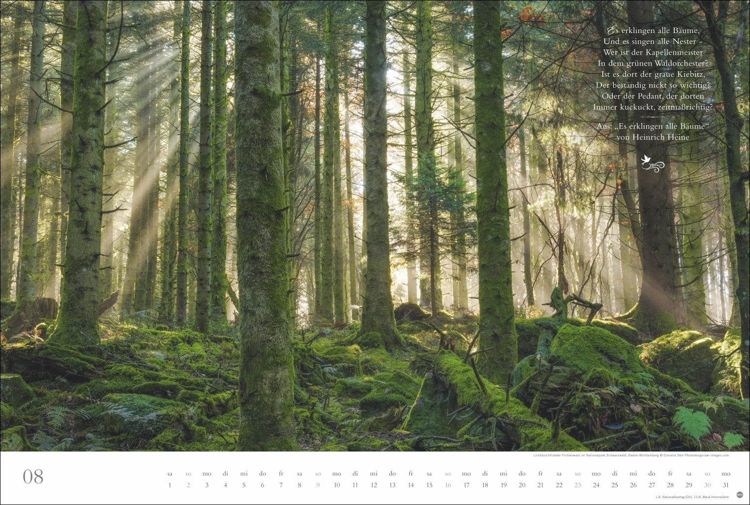 Wunderschöner großformatiger Fotokunst-Kalender mit beeindruckenden Aufnahmen aus Deutschlands Wäldern und schönen literarischen Zitaten deutscher Klassiker.
