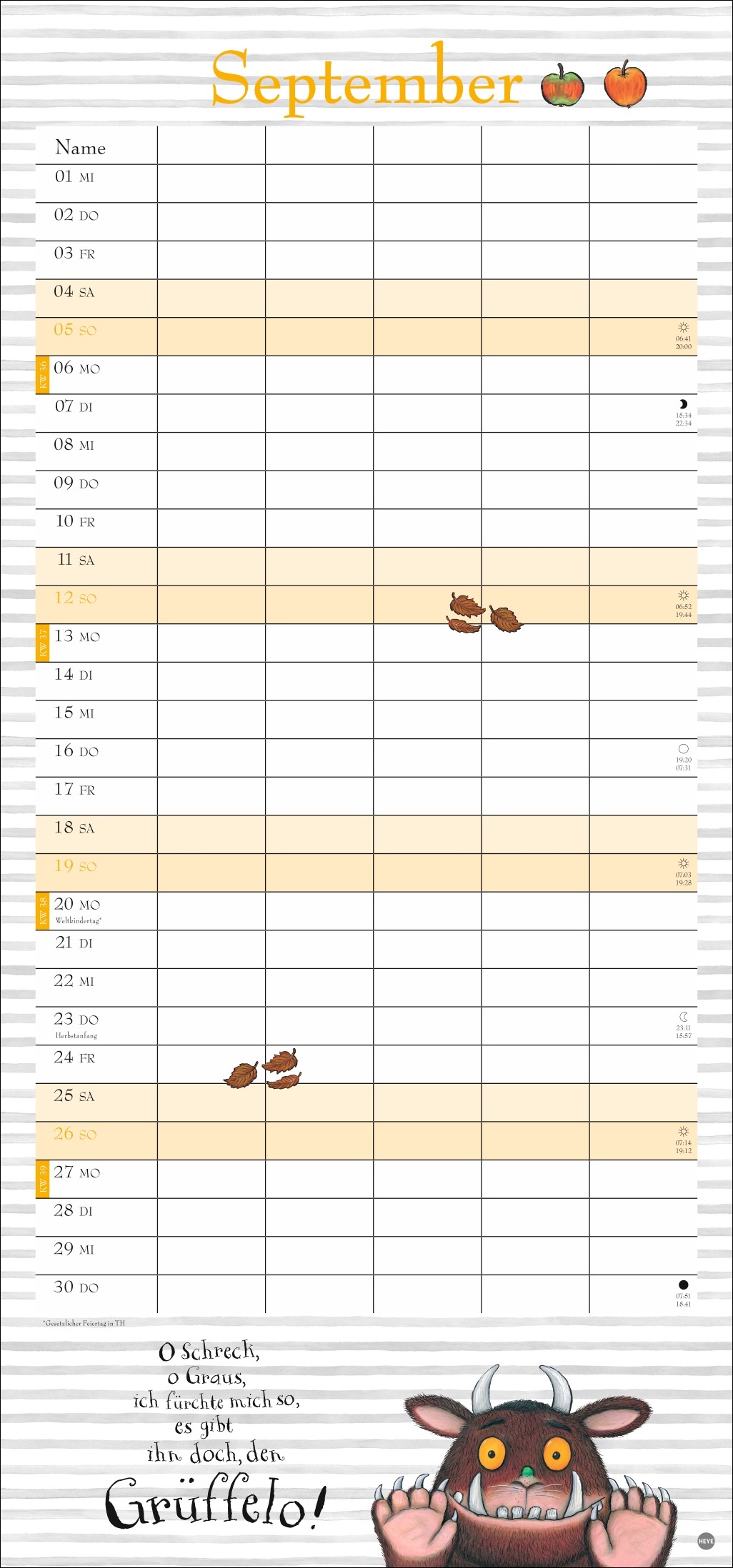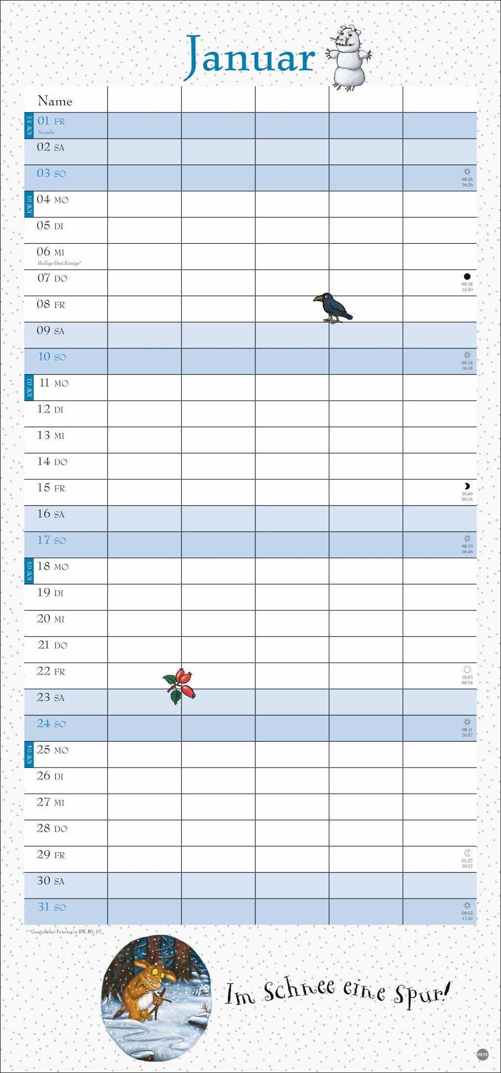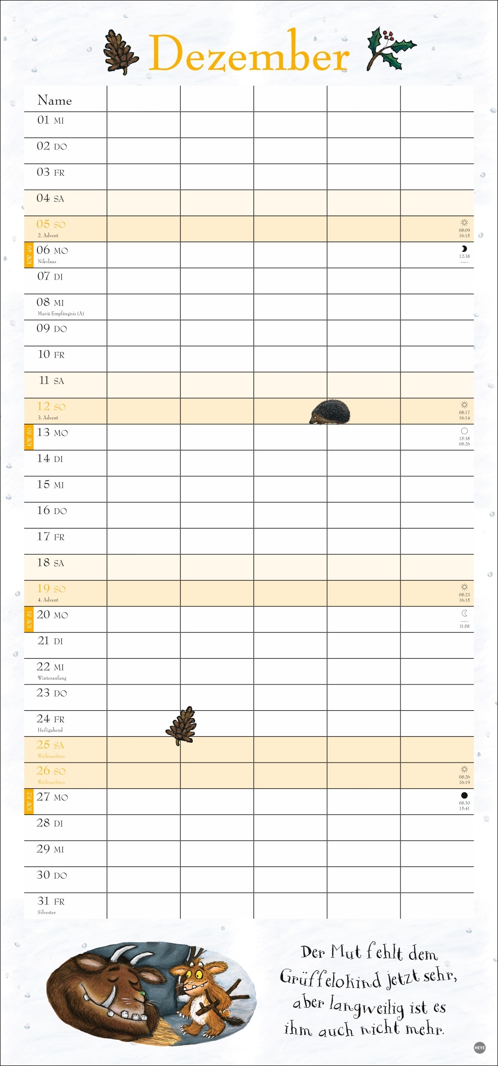 • Das ideale Geschenk für alle kleinen Mäuse und ihre Eltern: Der Grüffelo-Familienkalender mit 5 Spalten und 3-Monatsvorschau aufs Folgejahr