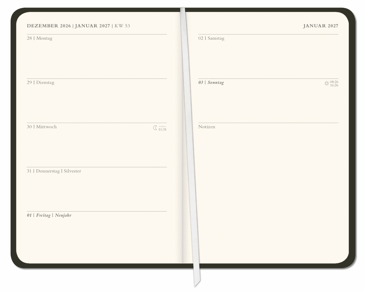 • Neutrales Design in edler Ausstattung: Planer mit hochwertigem, elfenbeinfarbigem Papier, inklusive Lesebändchen und Verschlussband