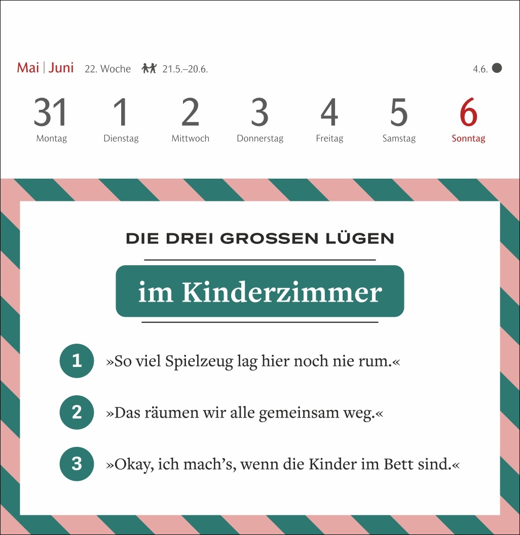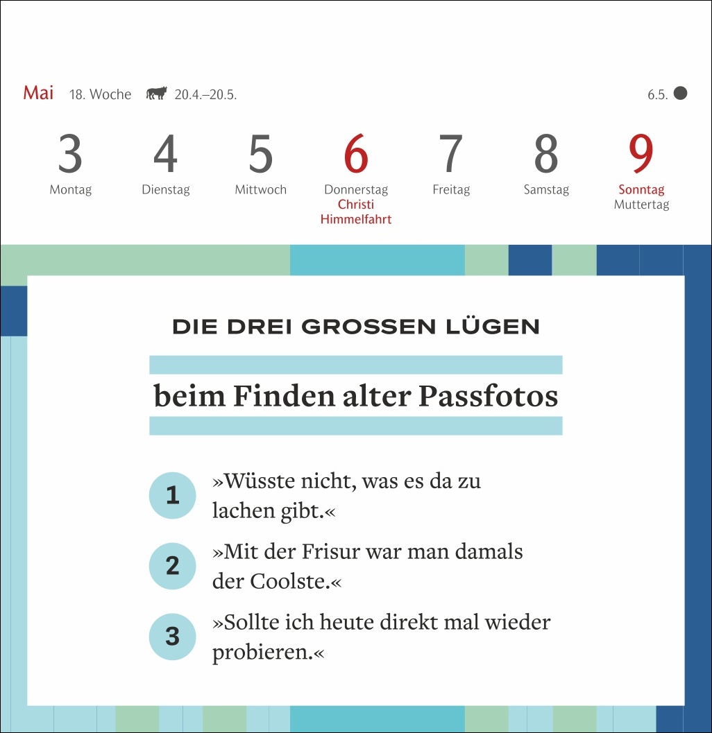 - Basierend auf der beliebten Kolumne „Die drei großen Lügen“ des SZ-Magazins: witziger Wochenkalender mit Postkarten zum Sammeln, Schmunzeln und Verschicken