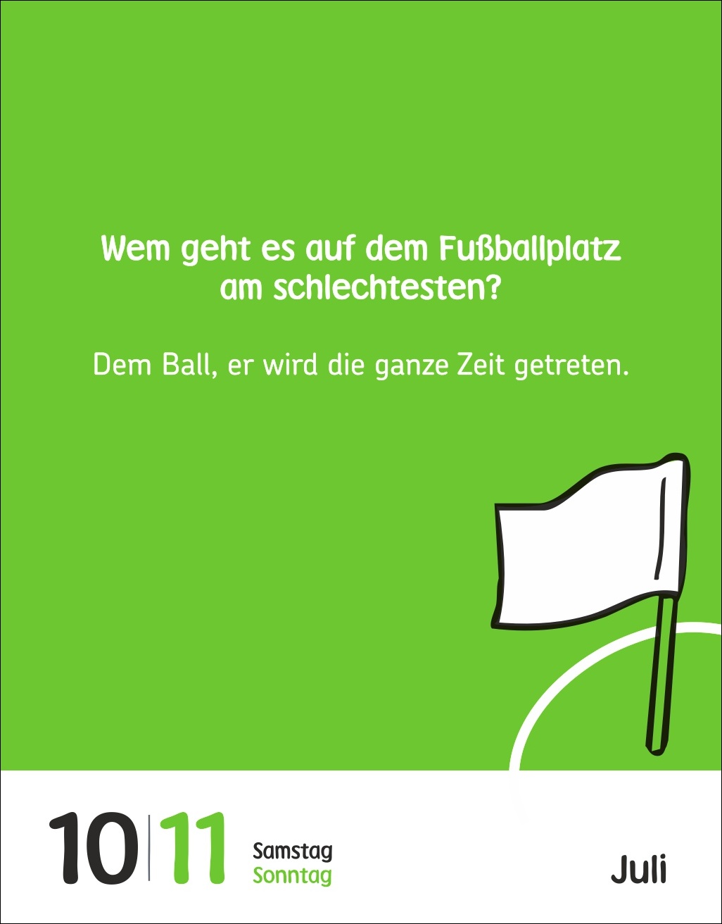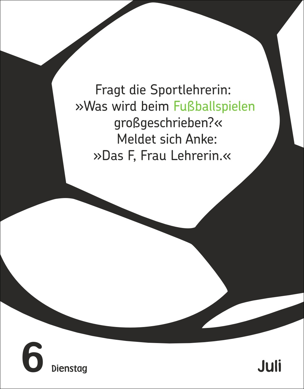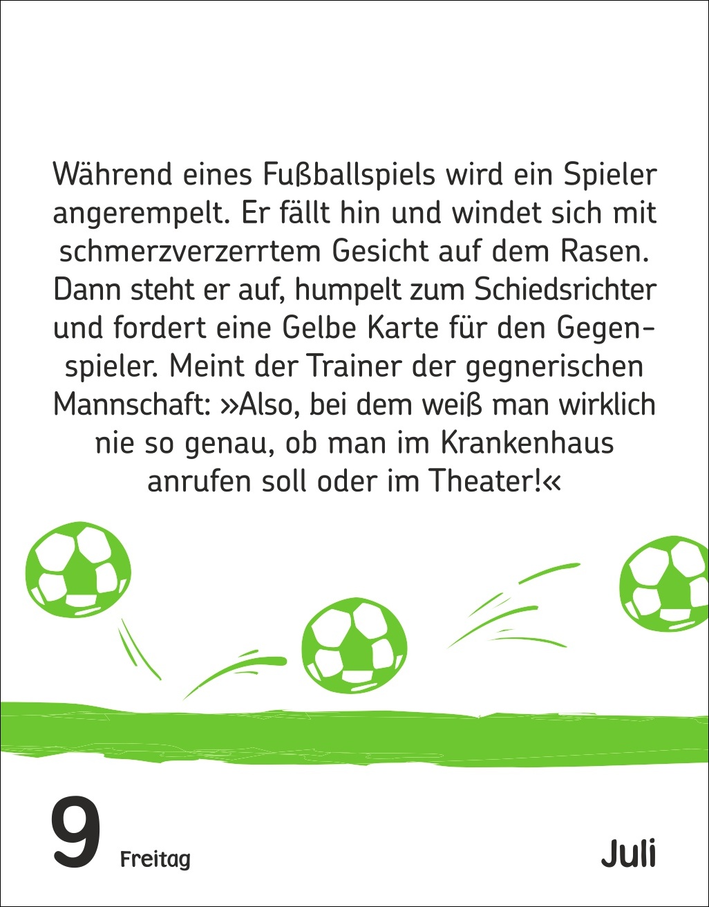 - Täglich coole Fußball-Sprüche: Dieser Fußball-Kalender sorgt mit 313 schrägen Weisheiten, Witzen und kuriosen Fußballfakten für gute Laune