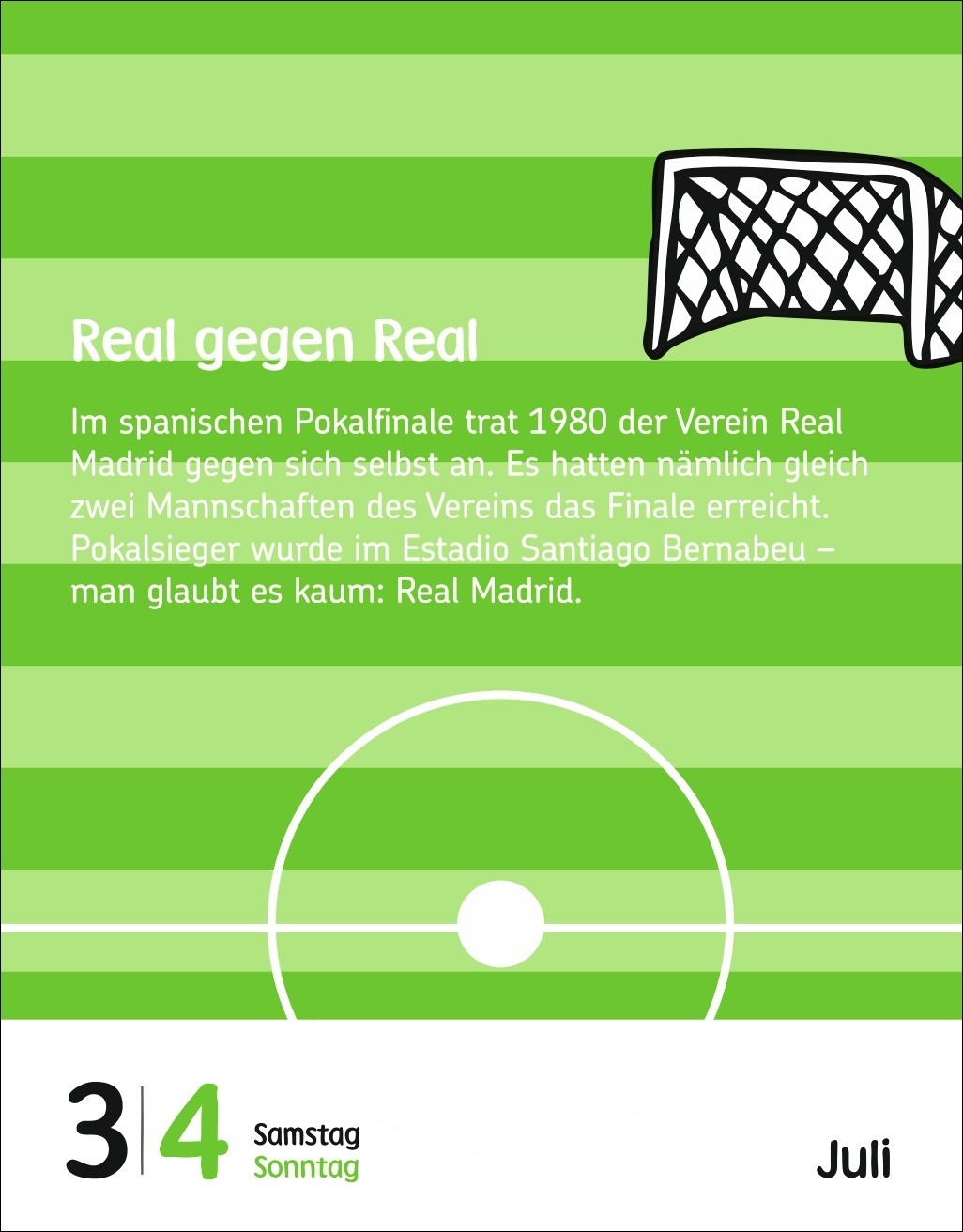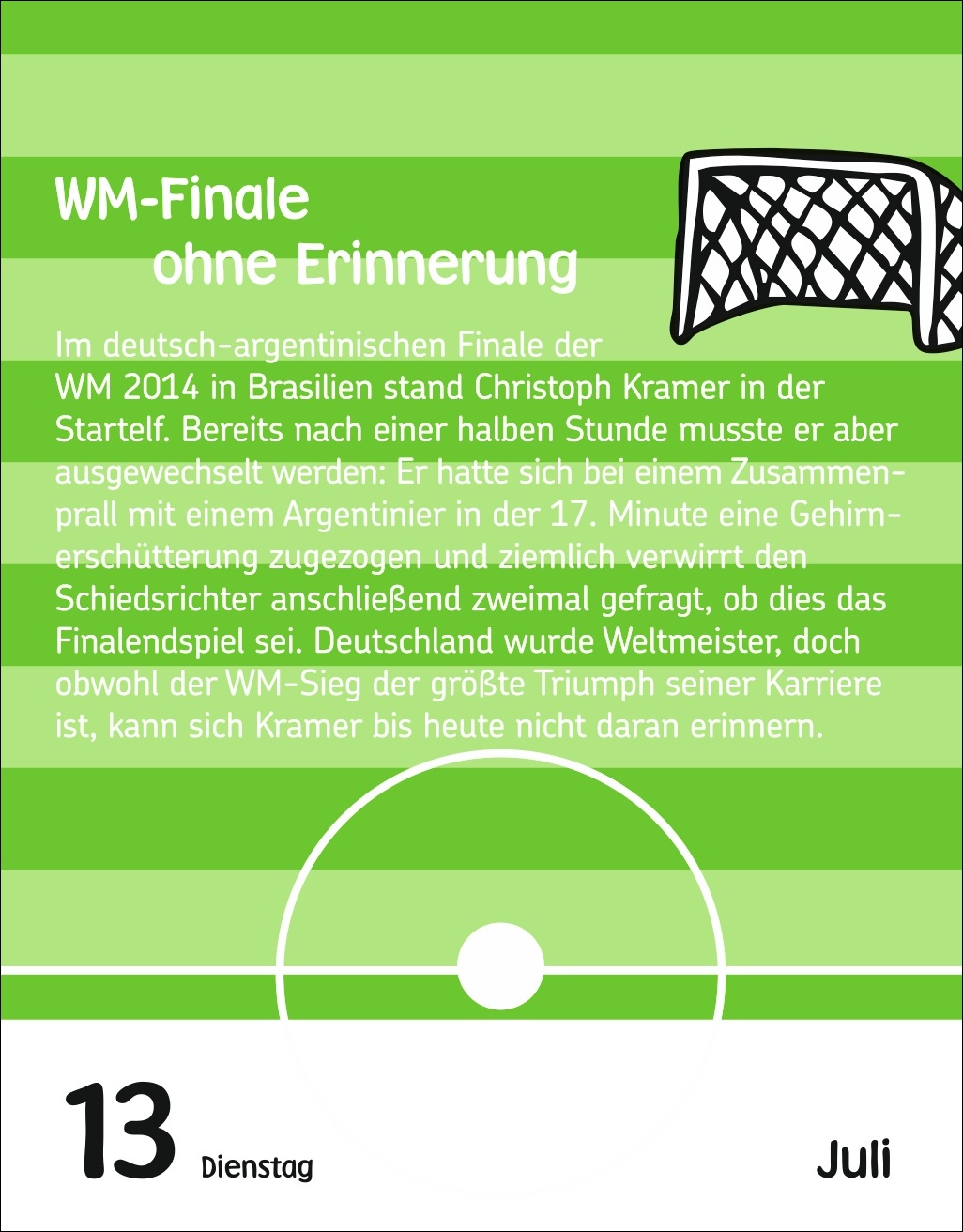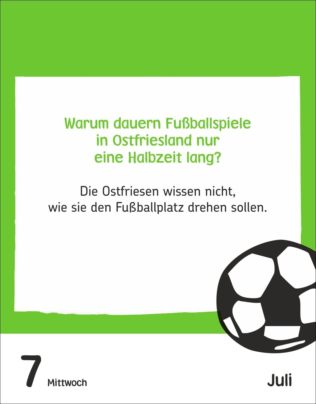 - Für junge Fußballfans von 6 bis 10 Jahren: Ob am Bett oder auf dem Schreibtisch – der Tagesabreißkalender im Format 12,5 x 16 cm passt in jedes Kinderzimmer