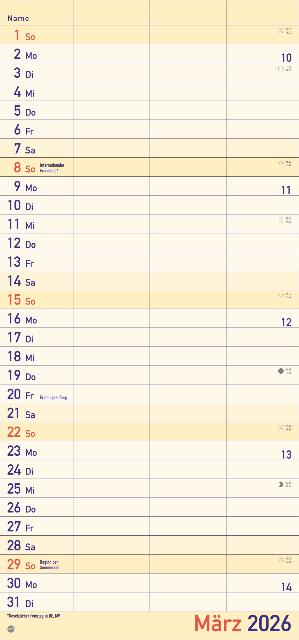 - Alle Termine im Blick: länglicher Monatskalender – groß gedruckt und mit breiten Spalten für eine gute Lesbarkeit
