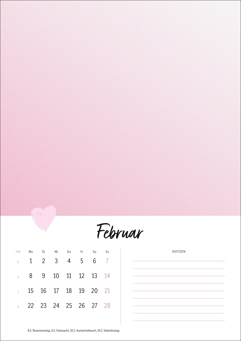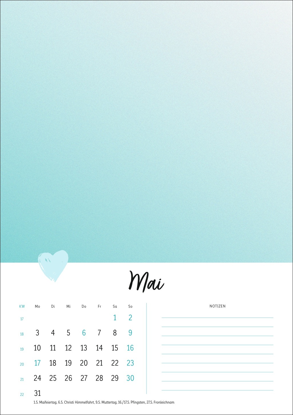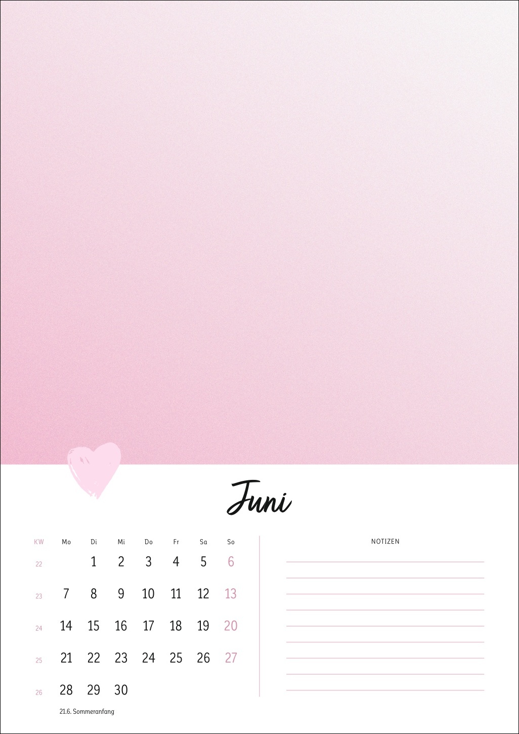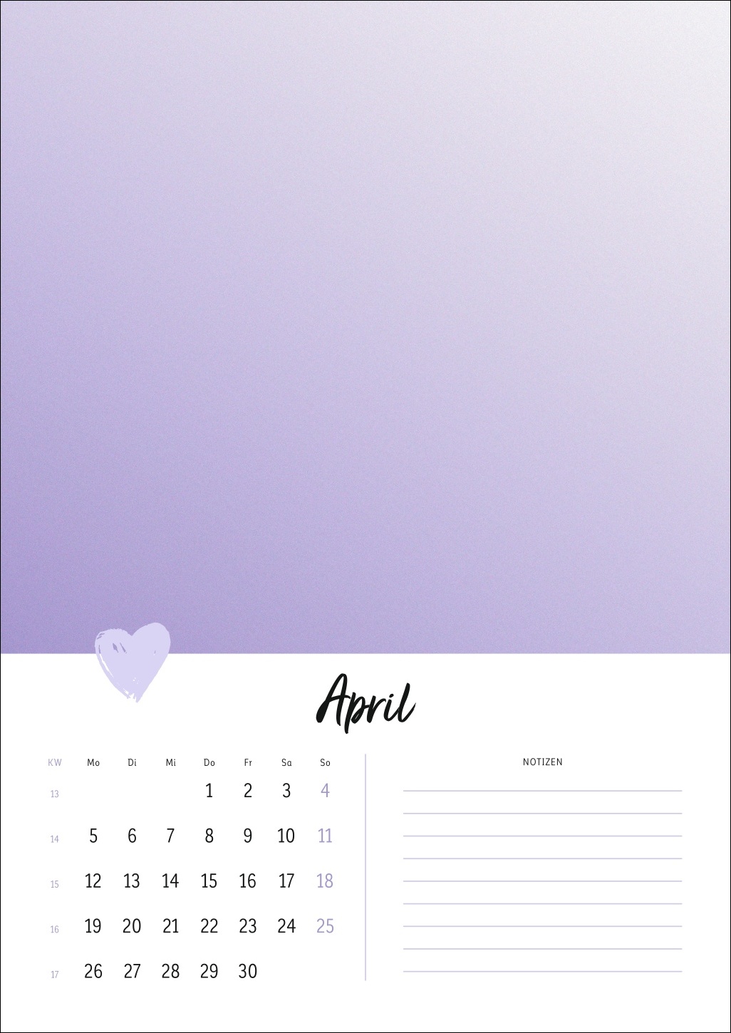 - Ein Cover in zartem Pastell mit Herz, ein kleines Kalendarium, Platz für Notizen: Der Rest dieses Kalenders ist Ihren DIY-Künsten und Ihrer Fantasie überlassen!