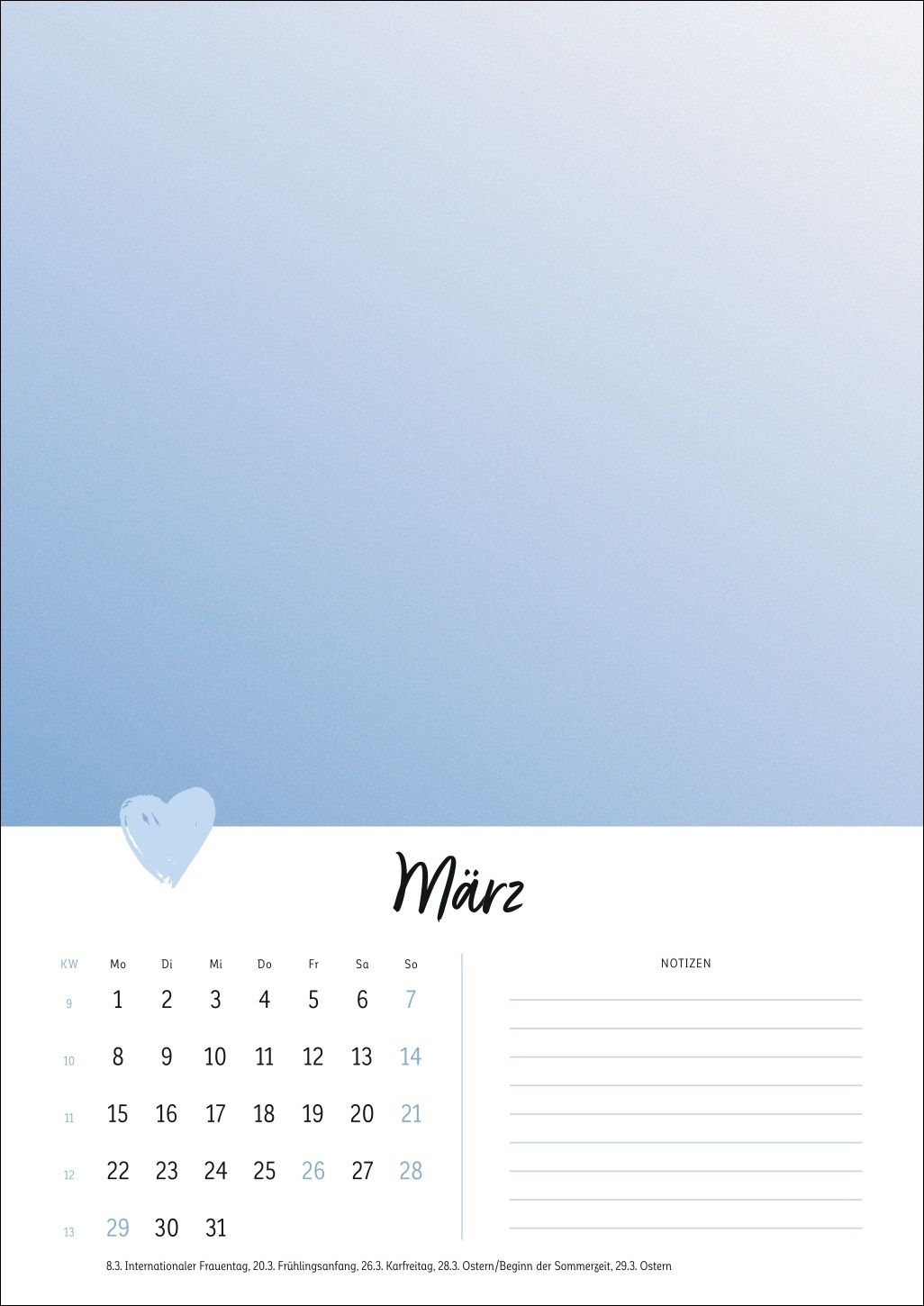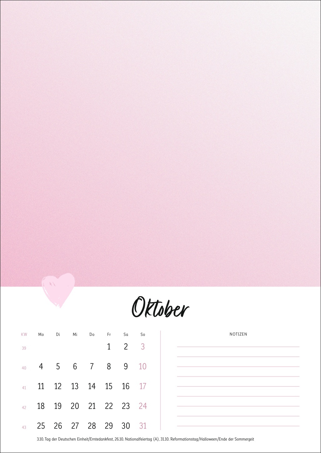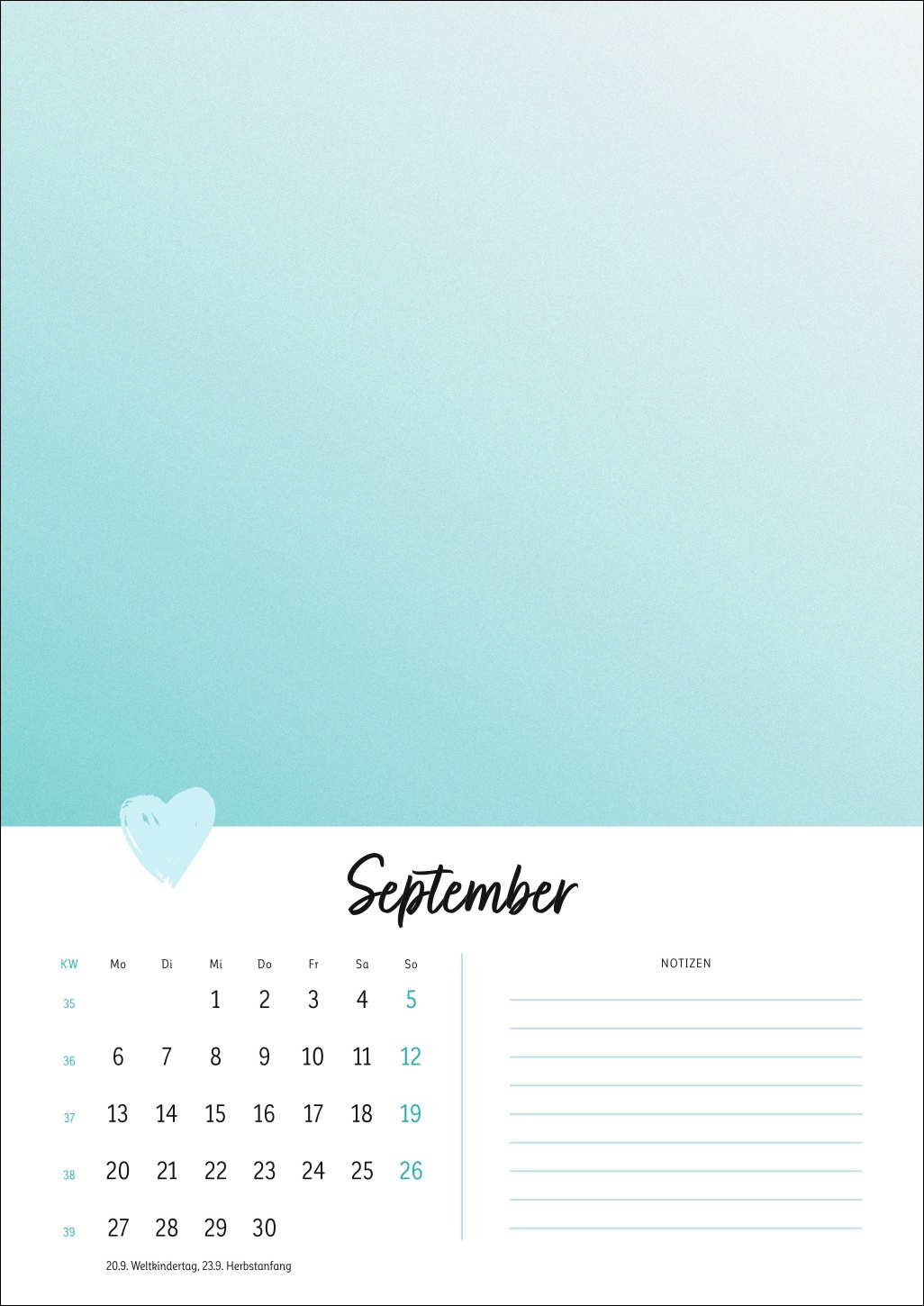 - Ein Cover in zartem Pastell mit Herz, ein kleines Kalendarium, Platz für Notizen: Der Rest dieses Kalenders ist Ihren DIY-Künsten und Ihrer Fantasie überlassen!