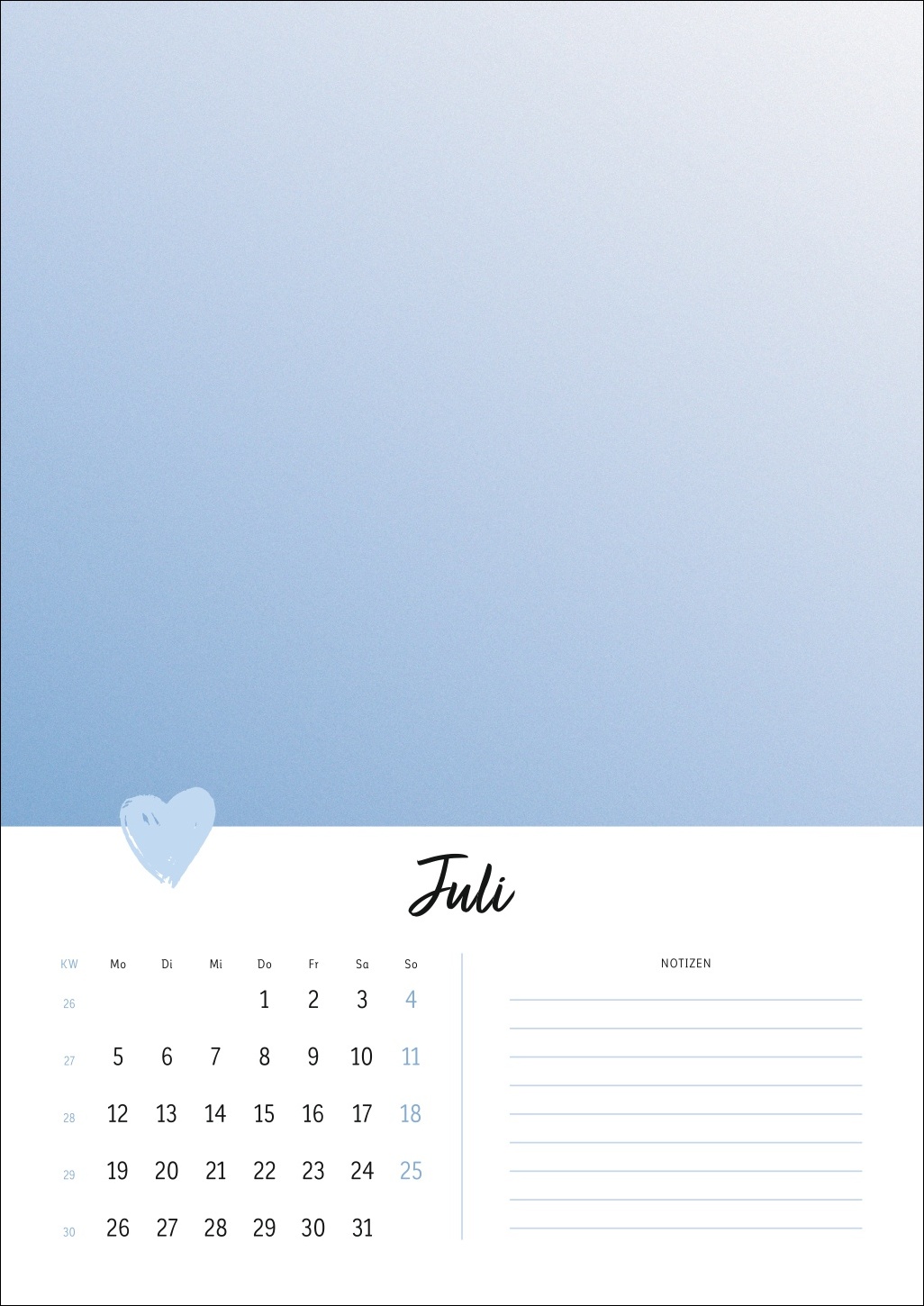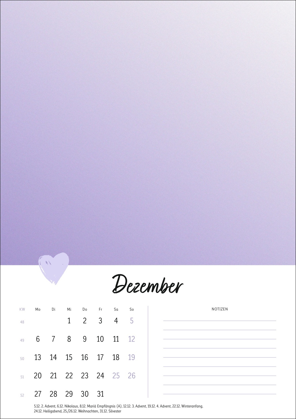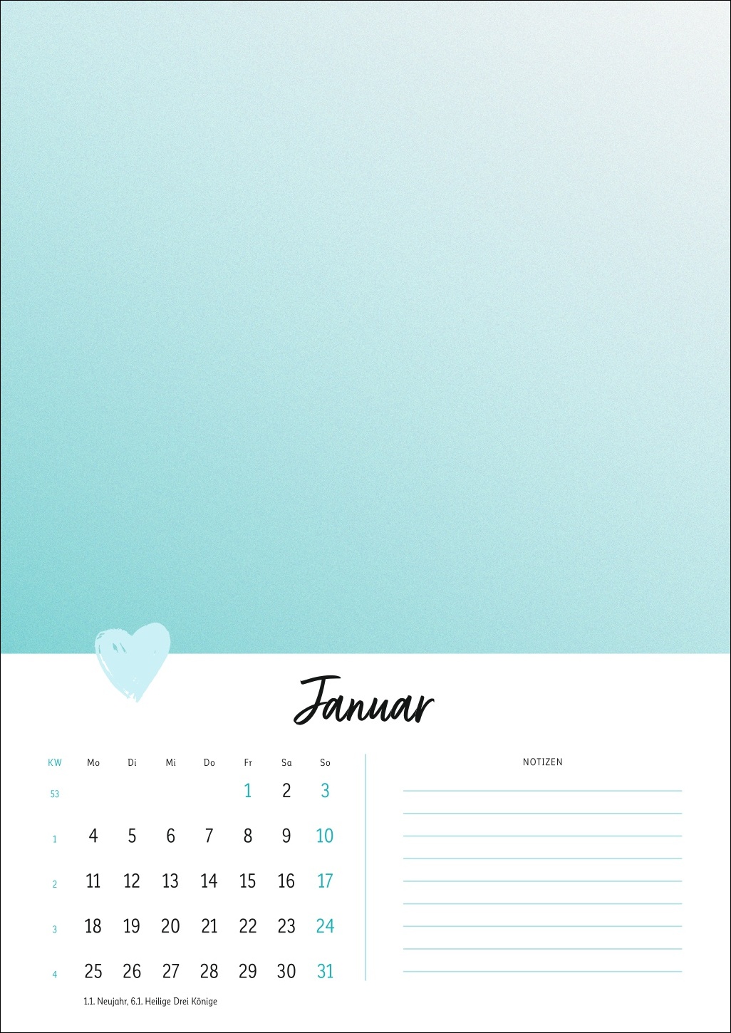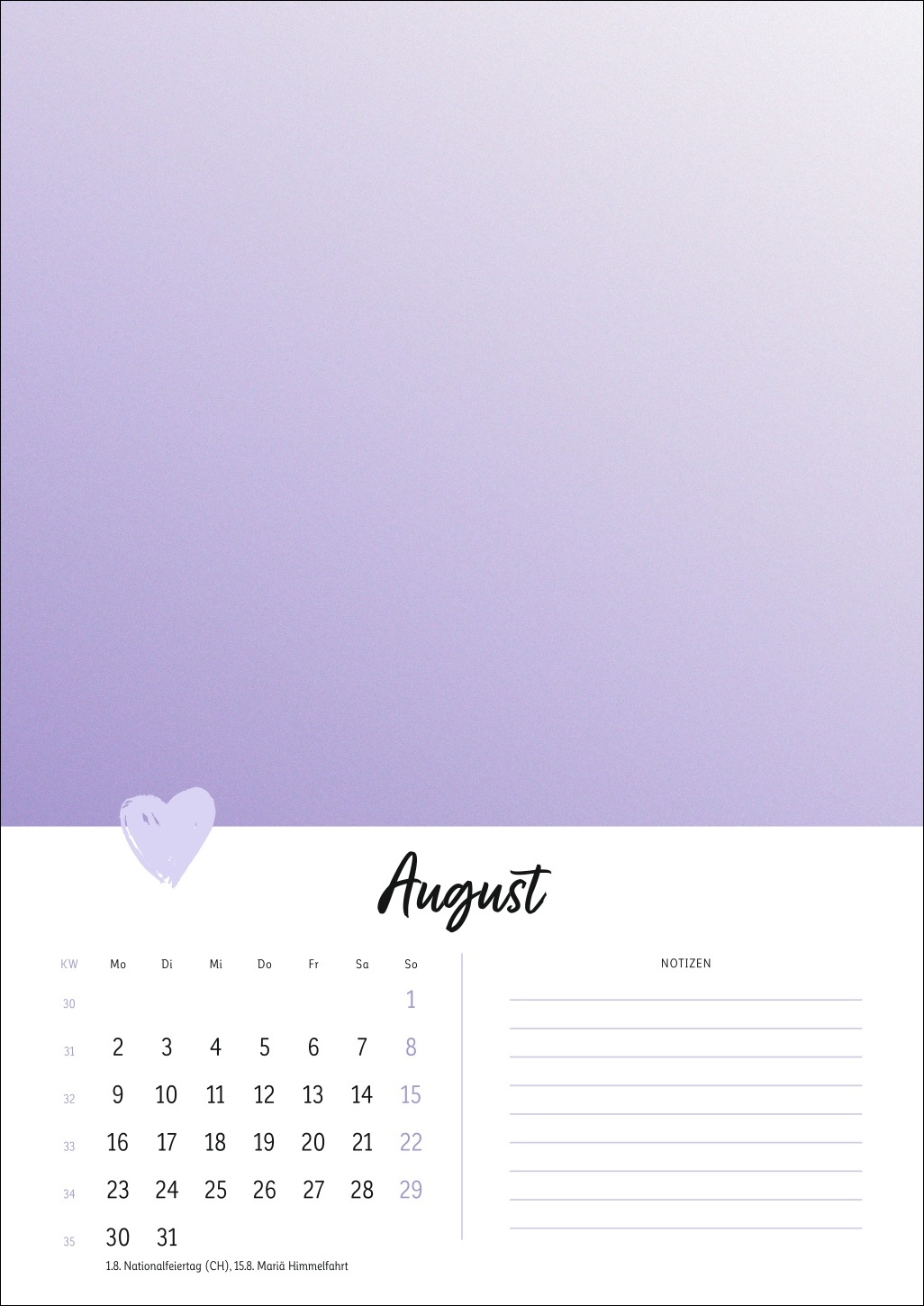 - Ein Cover in zartem Pastell mit Herz, ein kleines Kalendarium, Platz für Notizen: Der Rest dieses Kalenders ist Ihren DIY-Künsten und Ihrer Fantasie überlassen!