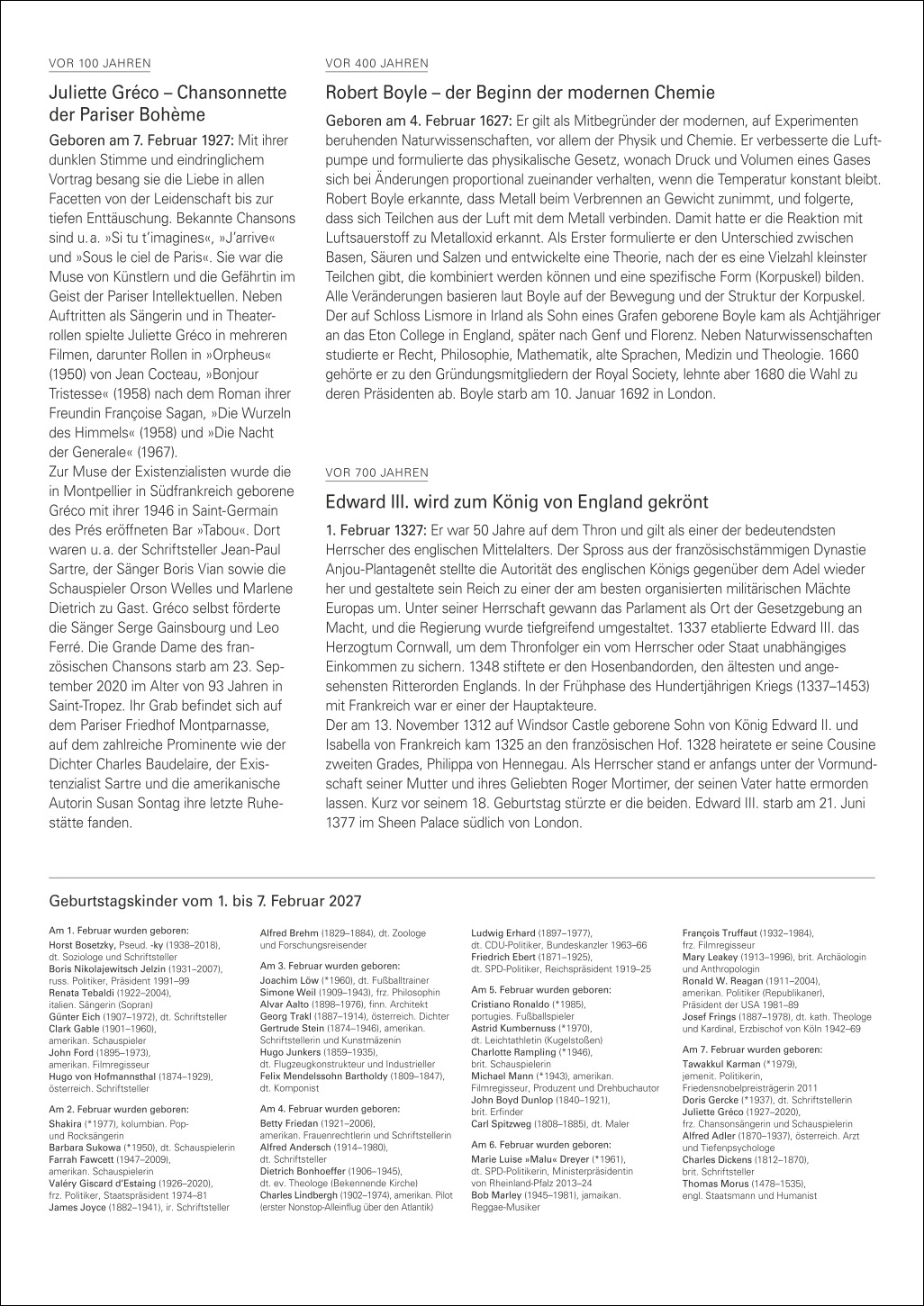 - Mehr als nur ein Kalender: Auf den Rückseiten jeder Woche spannende Infos zu Jubiläen und Gedenktagen sowie Hintergrundwissen zu berühmten Geburtstagskindern und historischen Ereignissen