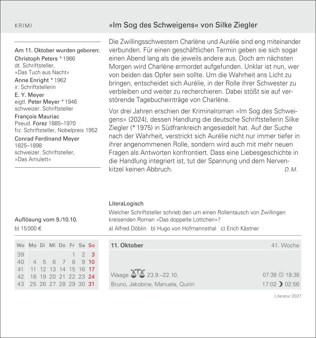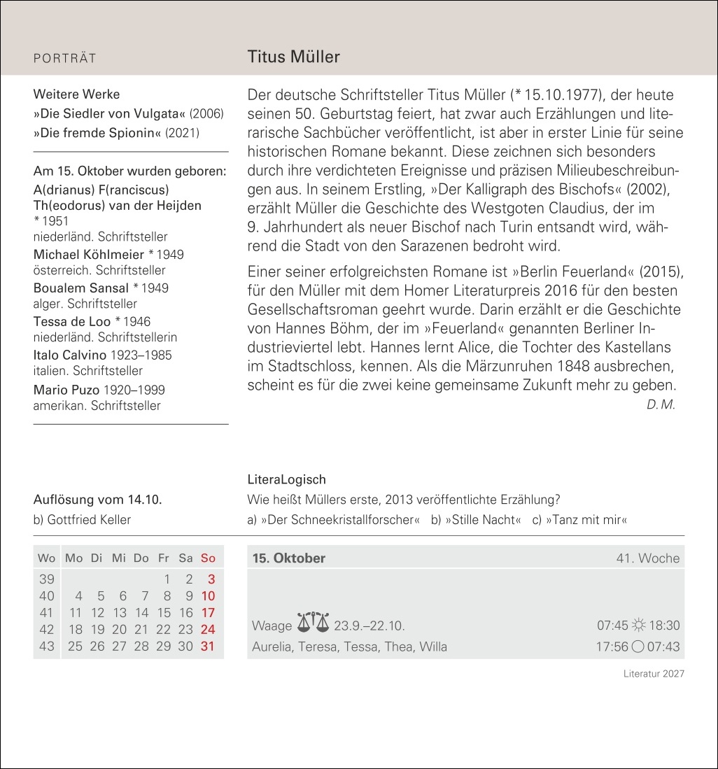 - Auf Streifzug durch die Welt der Bücher: Tischkalender mit Lesetipps aus allen Genres, spannenden Porträts von Autorinnen und Autoren, Klassiker und Newcomer der Literaturszene