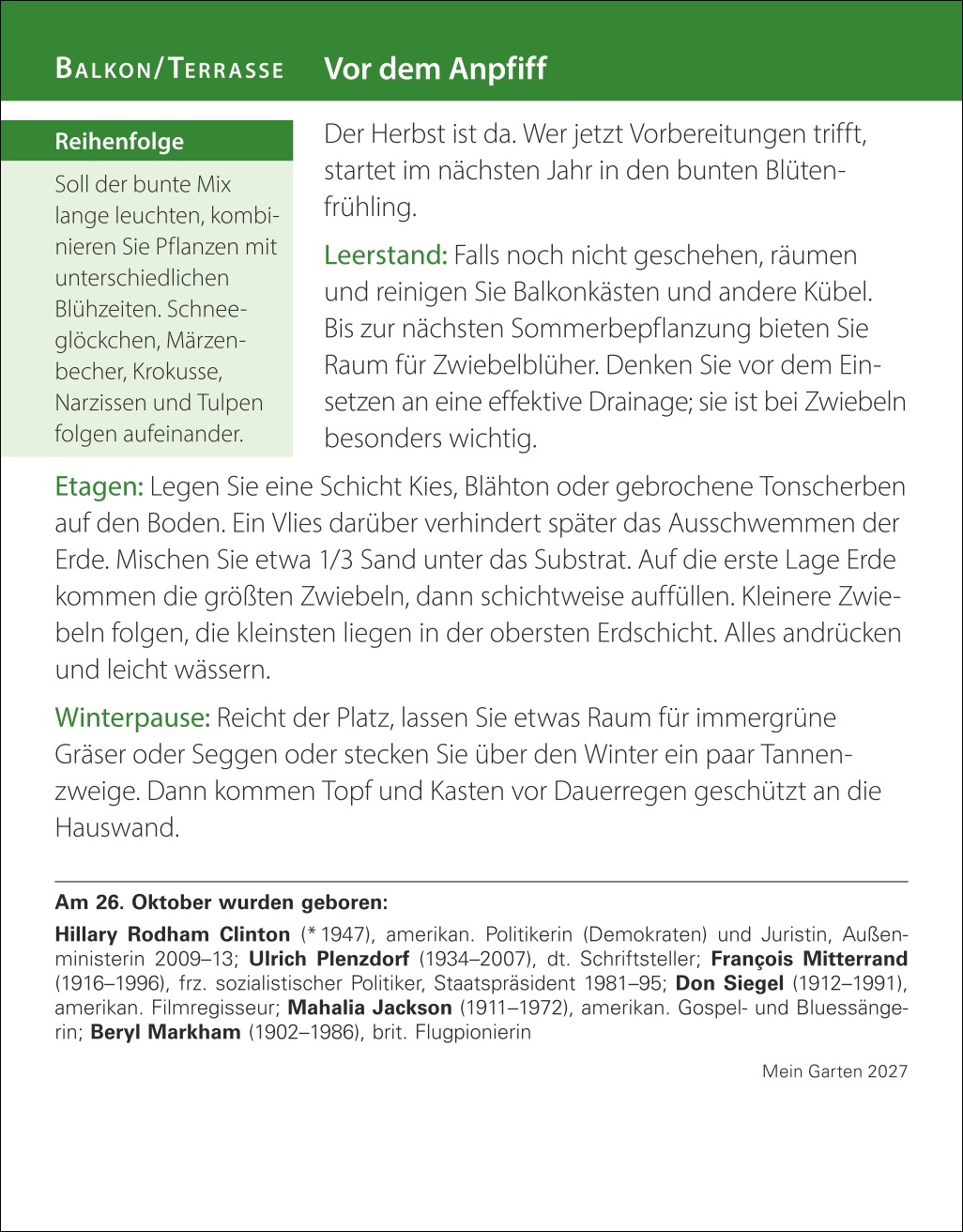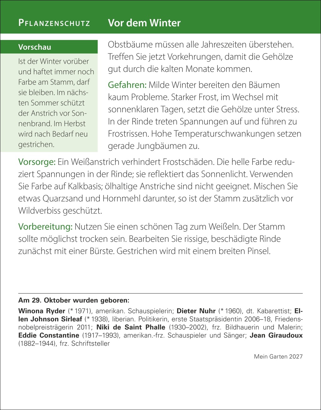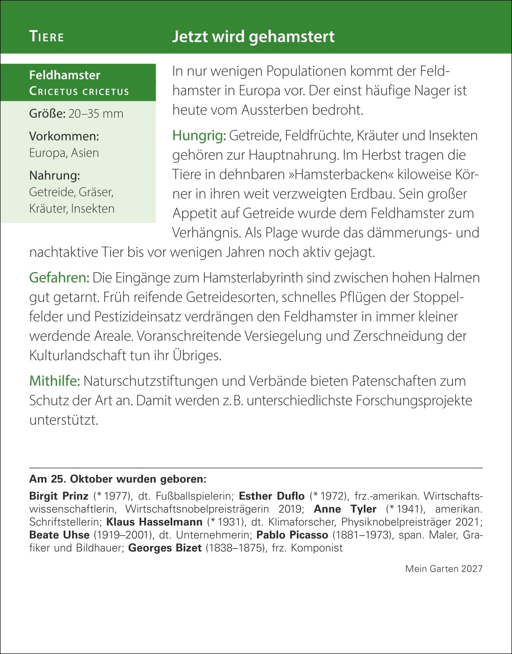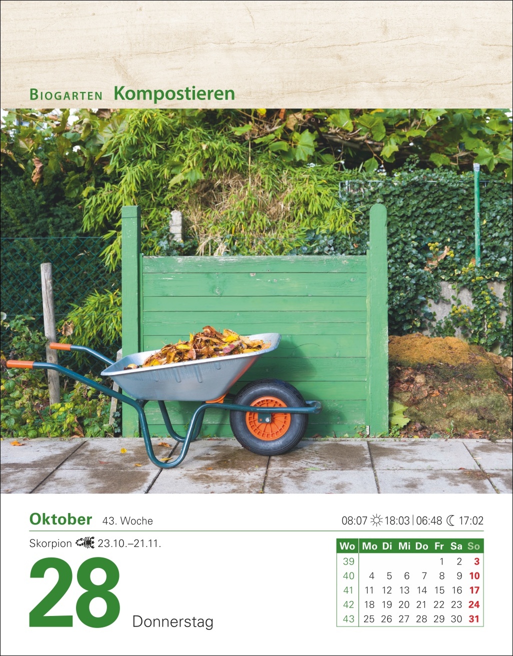 - Aufstellkalender mit Porträts von beliebten und exotischen Pflanzen und kompetenten Tipps und den wichtigsten To-dos für jeden Gartenmonat inklusive Nutz- und Ziergartentipps, natürlich Gärtnern im Biogarten, Aussaat- und Pflegetipps, Gartentier des Monats