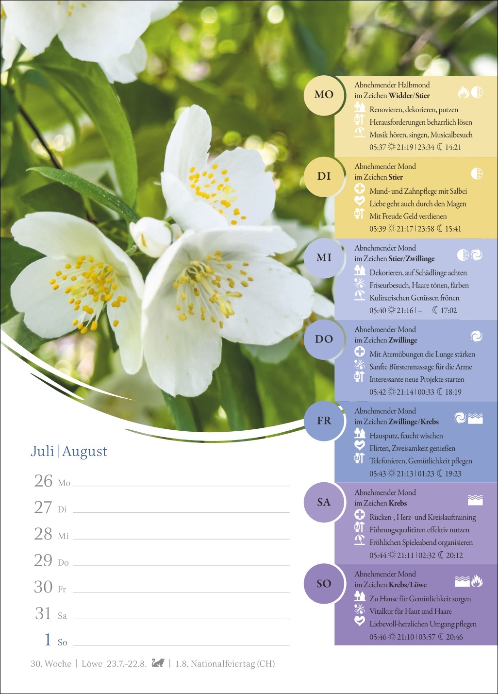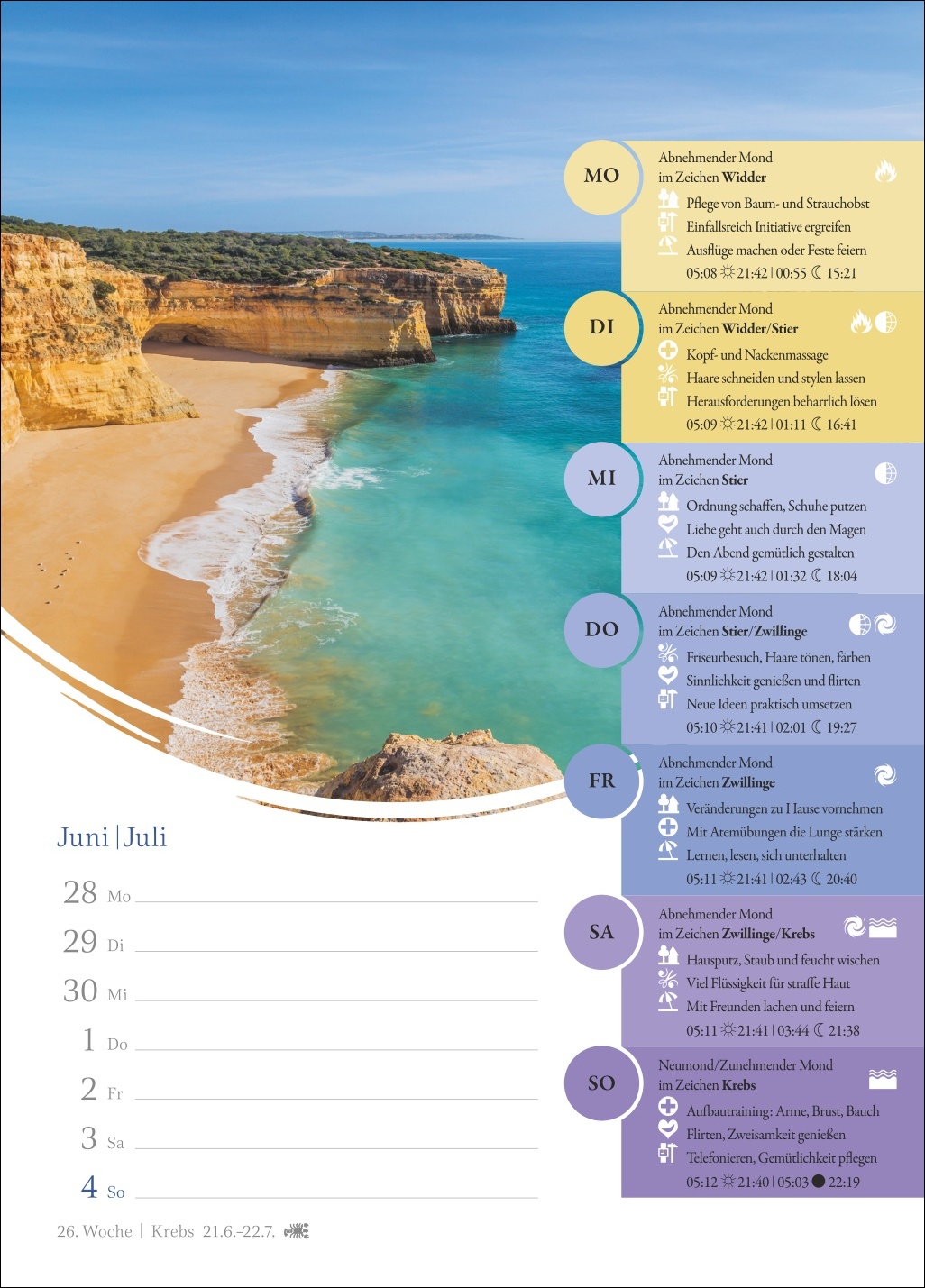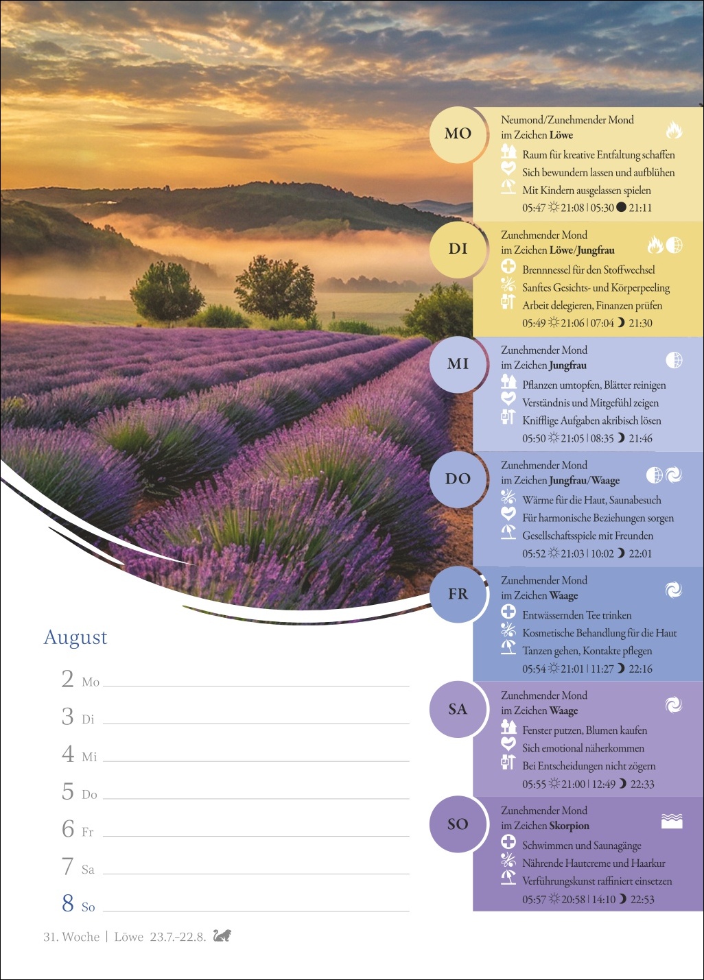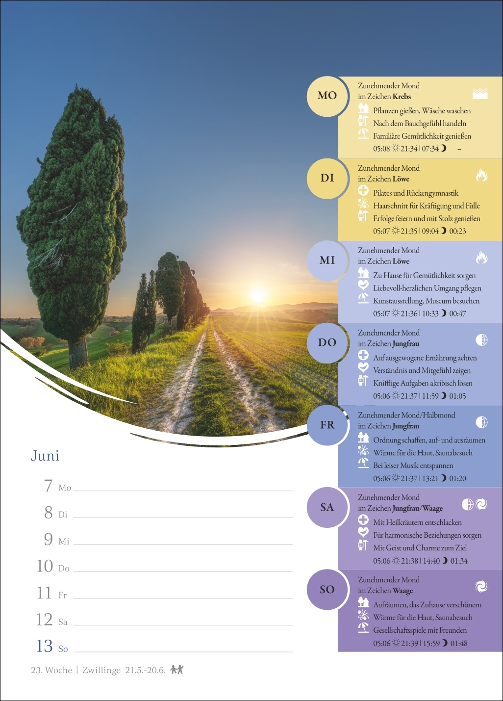 - Genau im Blick: Mondphasen, Sternzeichen und Elemente für jeden Tag der Woche inklusive stimmungsvoller Naturaufnahmen