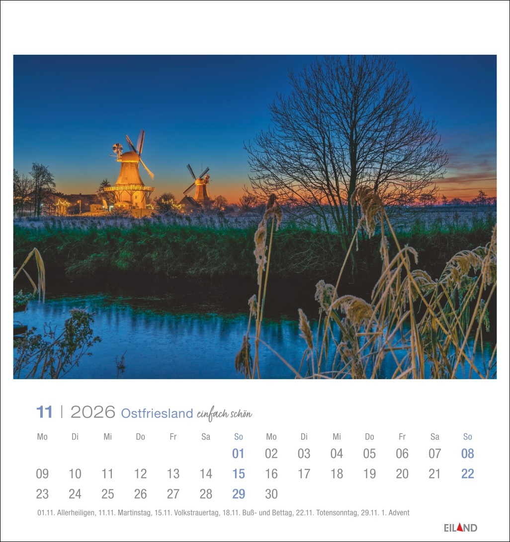 • Ein beliebtes Ziel zahlreicher Urlauber ist die Landschaft Ostfrieslands mit Häfen, Städten, Wattenmeer, den Mooren und Sielen. Auch die Strände der ostfriesischen Inseln sind mit fotogenen Motiven in diesem Eiland-Postkartenkalender vertreten.