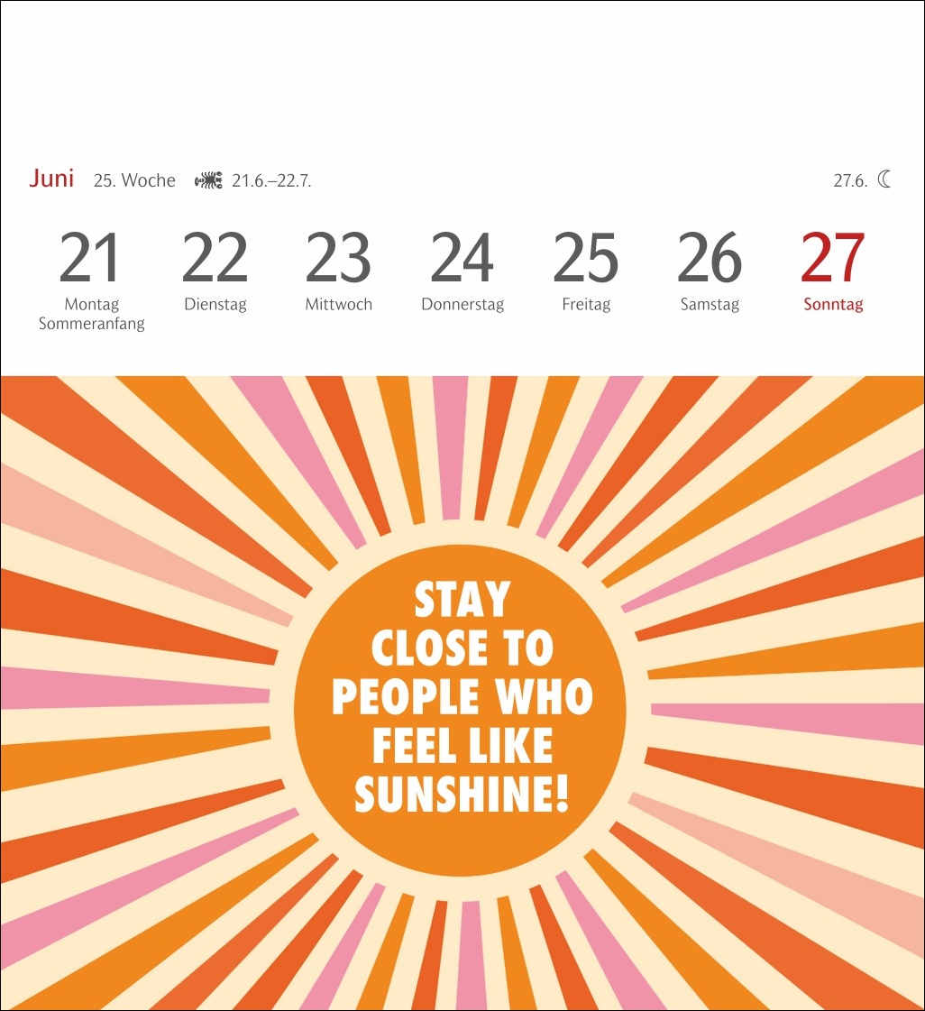 - „Wer den Tag mit einem Lachen beginnt, hat ihn bereits gewonnen“: Kalender zum Aufstellen oder Aufhängen mit positiven Gedanken und optimistischen Sprüchen