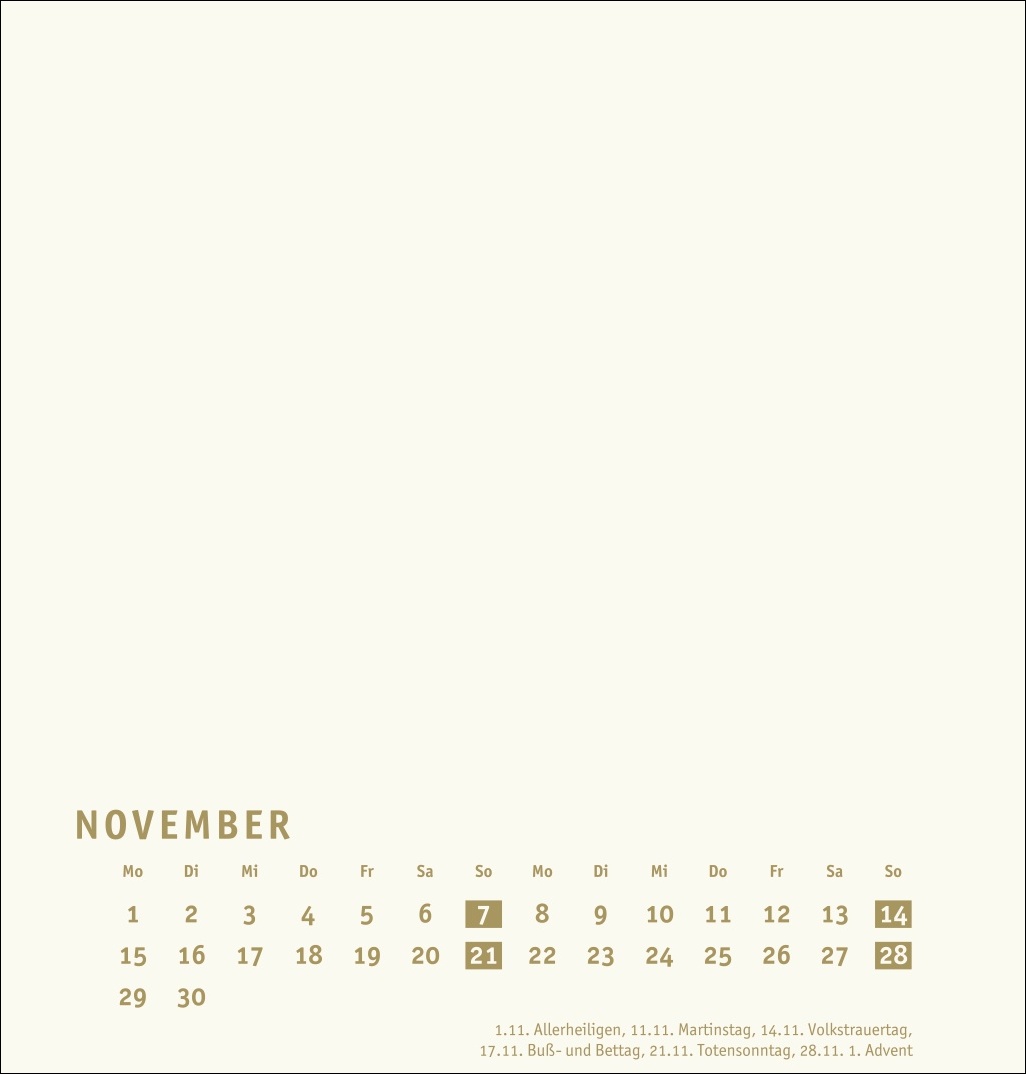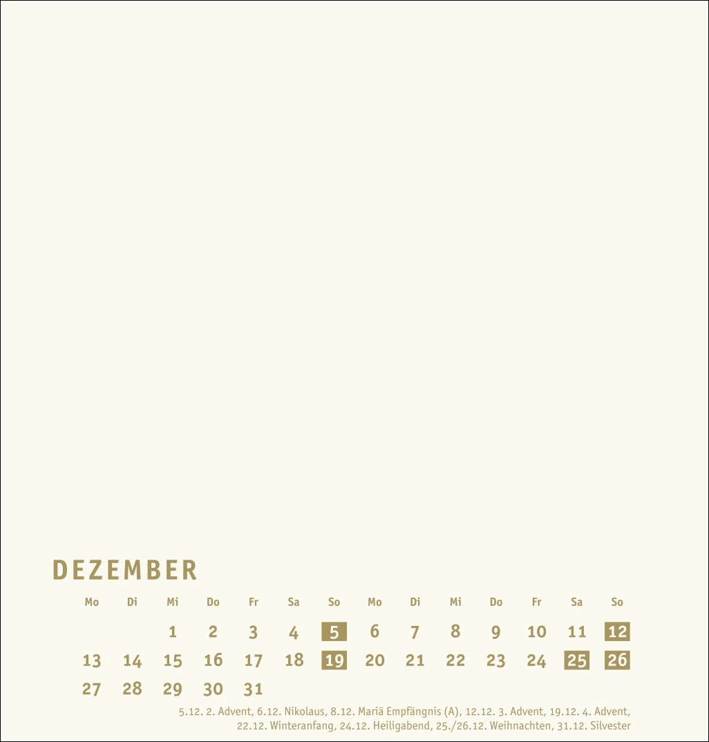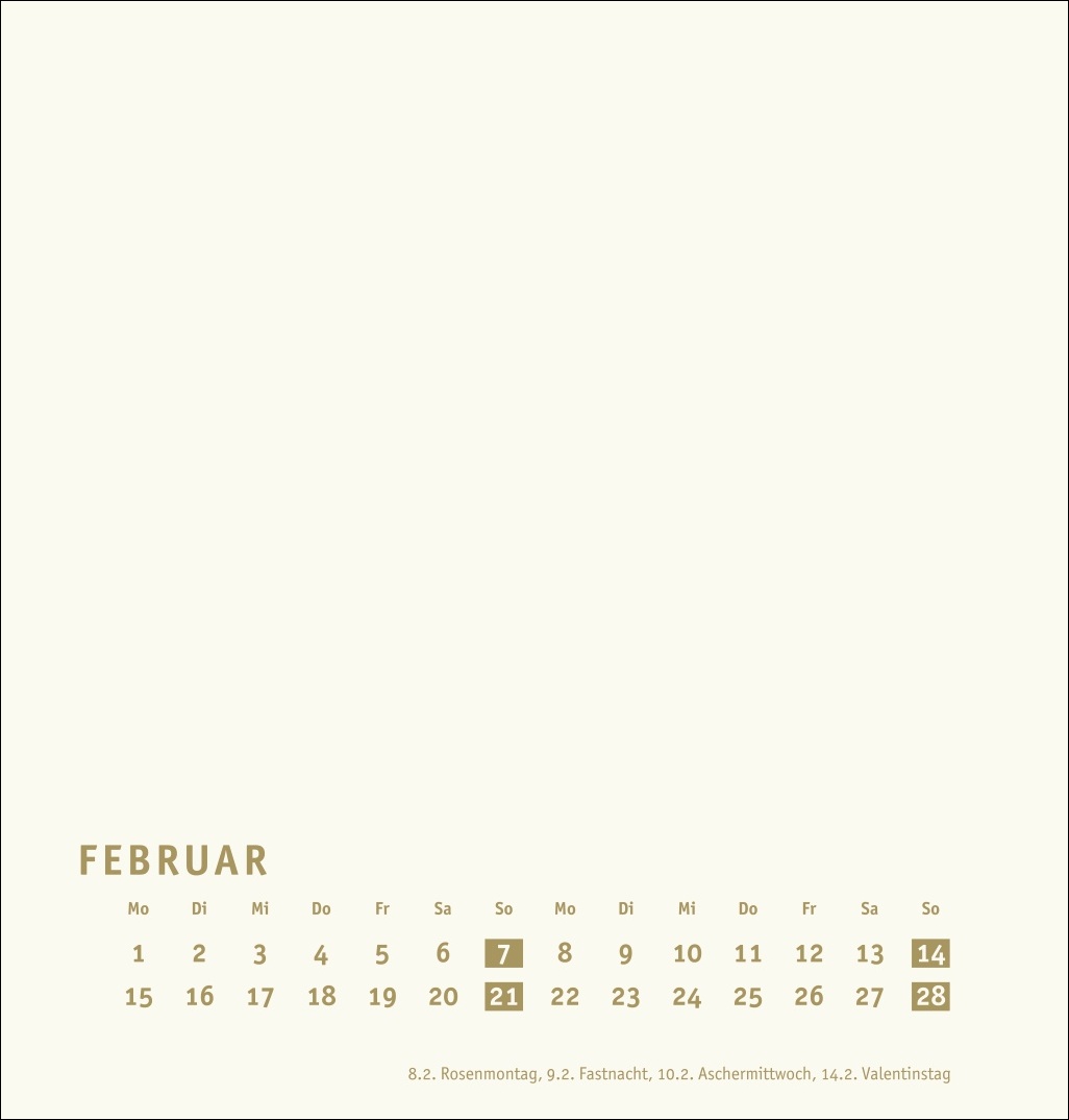 • Monatskalender (21 x 22 cm) mit goldenen Farbakzenten auf edlem chamoisfarbenem Karton und Deckblatt in Gold