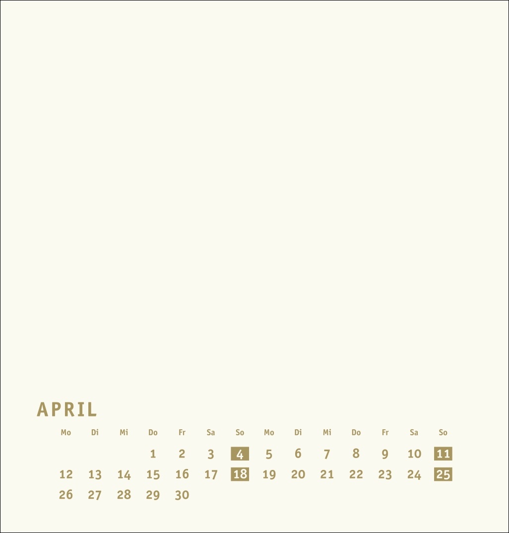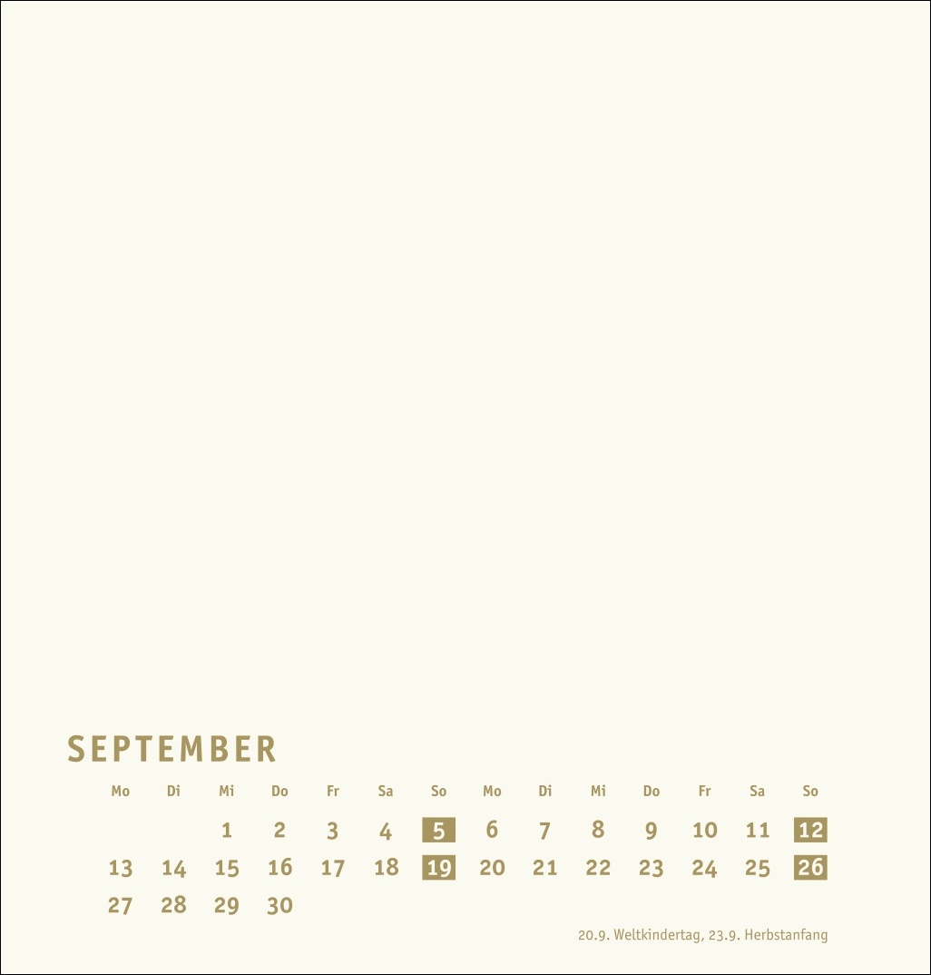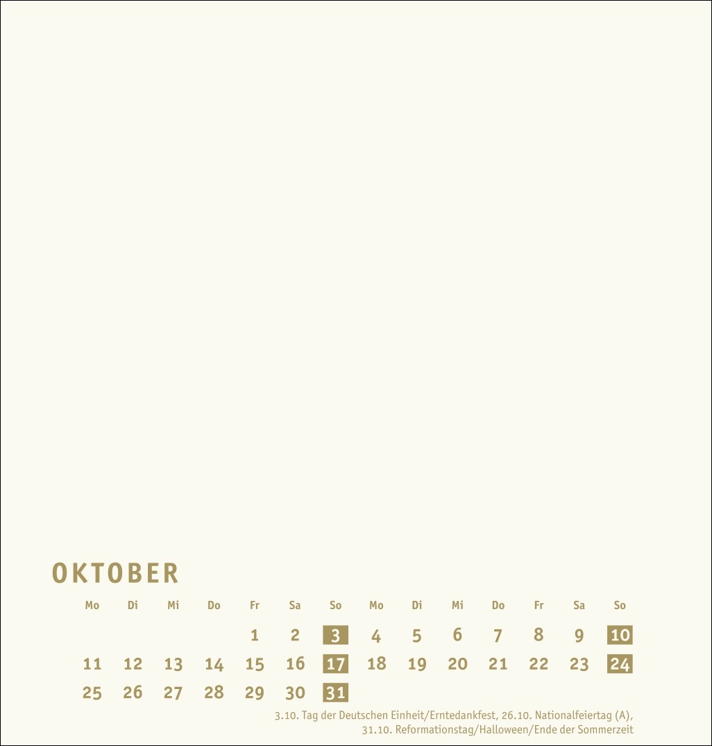 • Monatskalender (21 x 22 cm) mit goldenen Farbakzenten auf edlem chamoisfarbenem Karton und Deckblatt in Gold