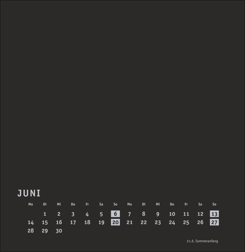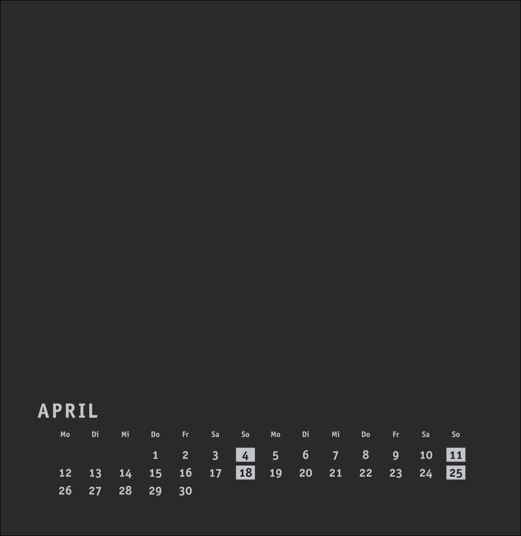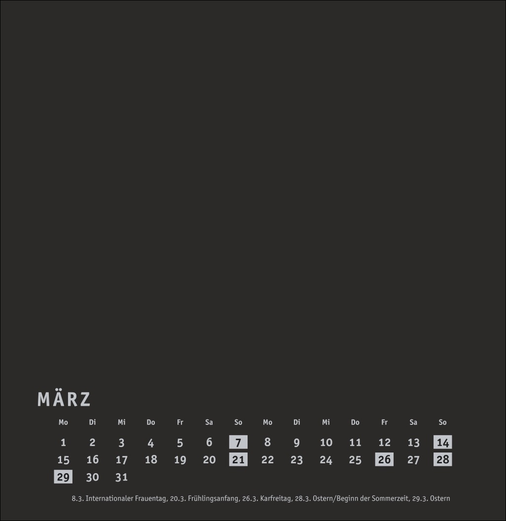 - Kalender im quadratischen Format mit schwarzer Grundfarbe als neutralem Hintergrund