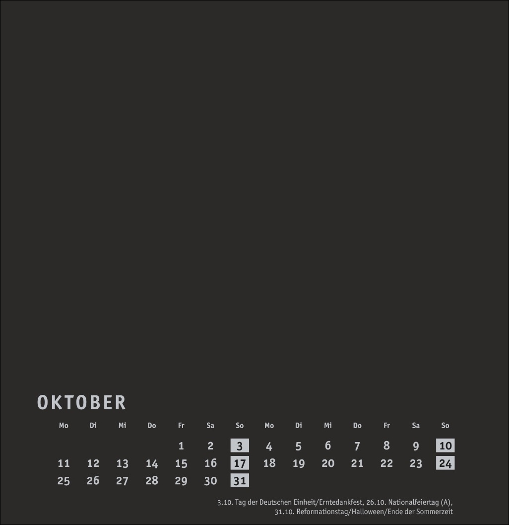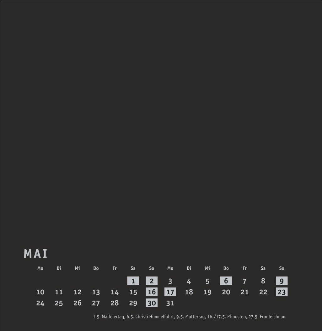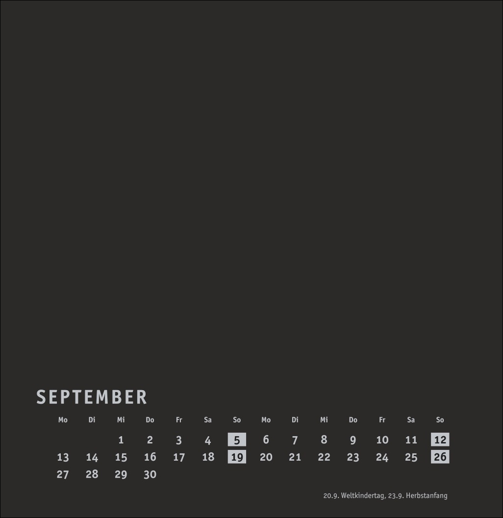- Kalender im quadratischen Format mit schwarzer Grundfarbe als neutralem Hintergrund
