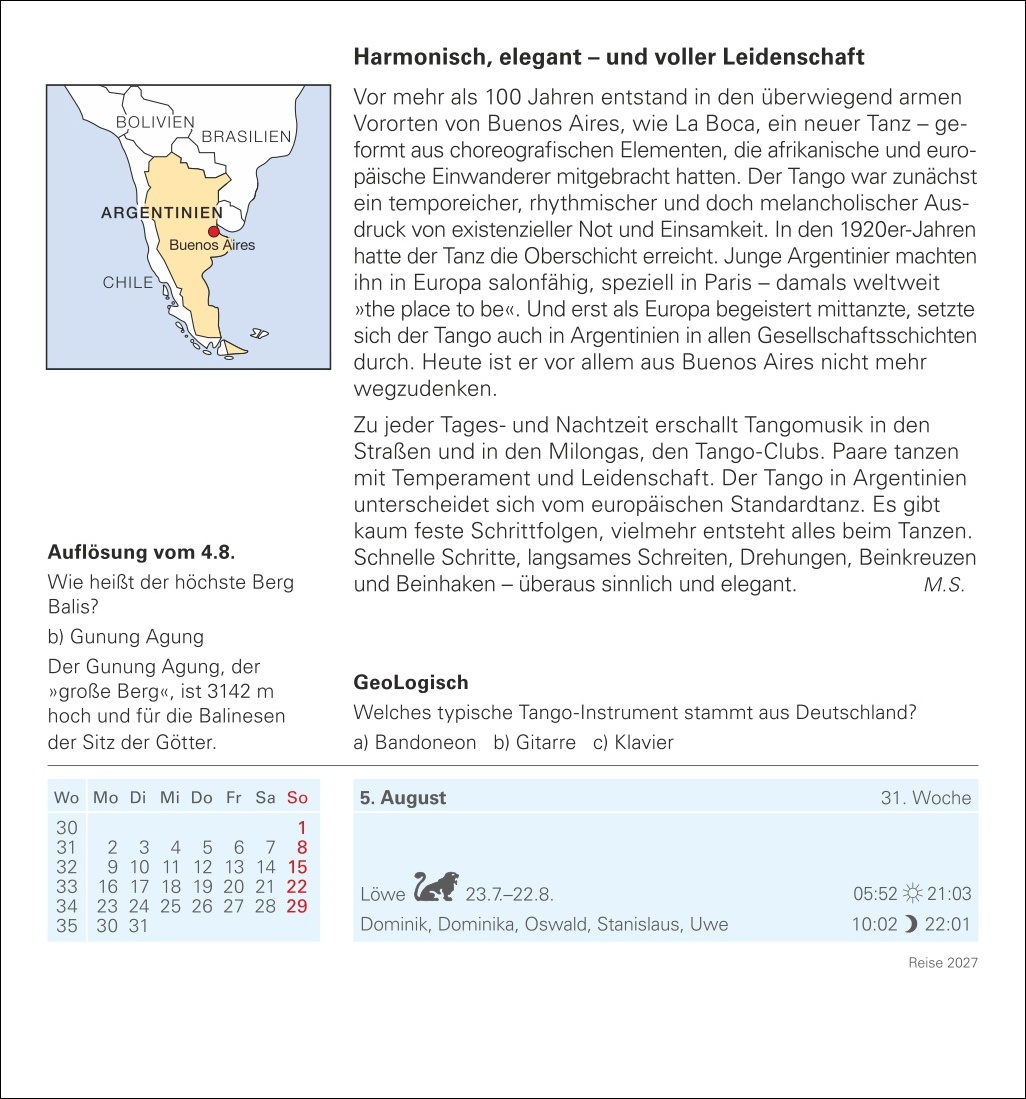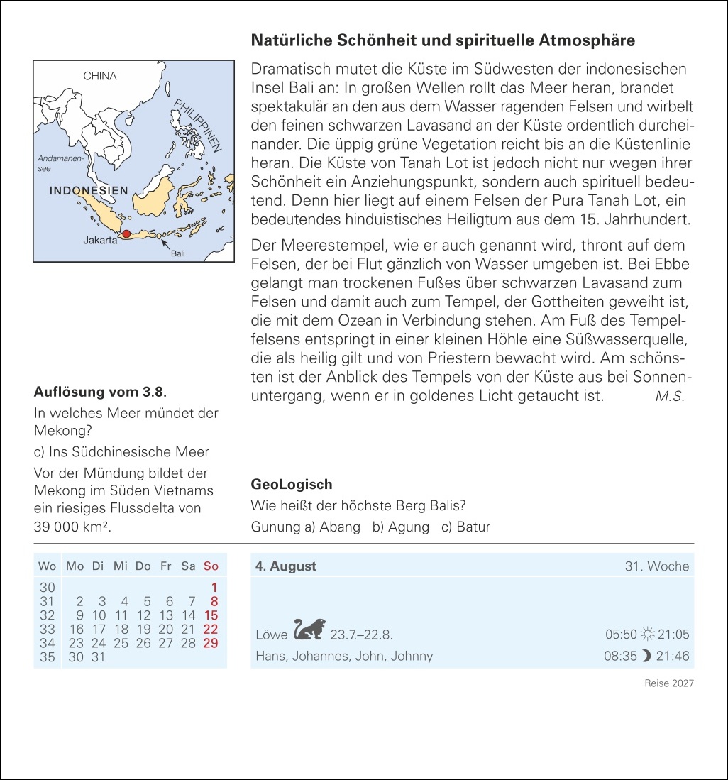 • Fremde Kulturen entdecken und das Wissen über die Welt erweitern: mit vielen spannenden Fakten von erfahrenen Reiseautoren, täglichem Quiz für Globetrotter und kleiner Karte auf der Rückseite