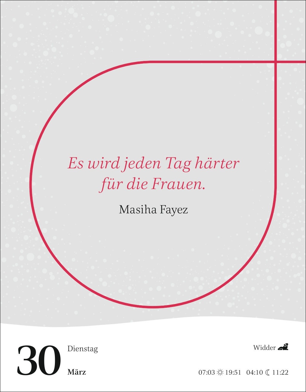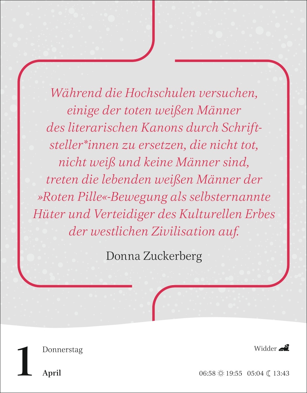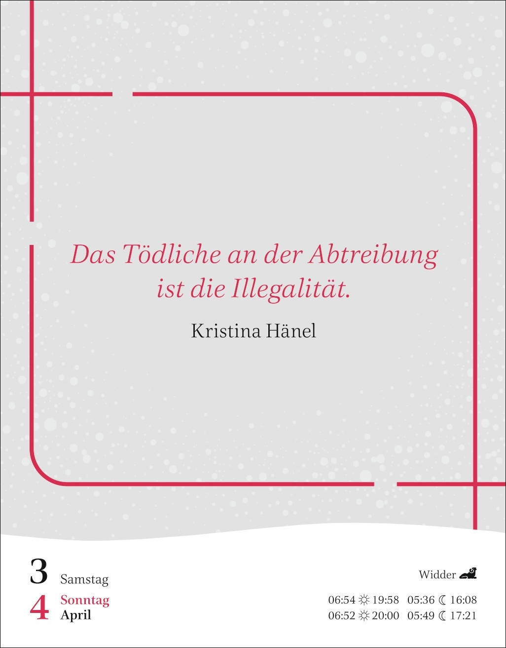 - Von Elisabeth II. über Ferda Ataman, Margot Friedländer, Tsitsi Dangarembga, Emmy Noether, Özlem Türeci, Hypatia von Alexandria, Arundhati Roy bis Barbara Schöneberger und Santigold: Tischkalender mit klugen Weisheiten und scharfsinnigen Zitaten berühmter Frauen aus allen Epochen der Weltgeschichte