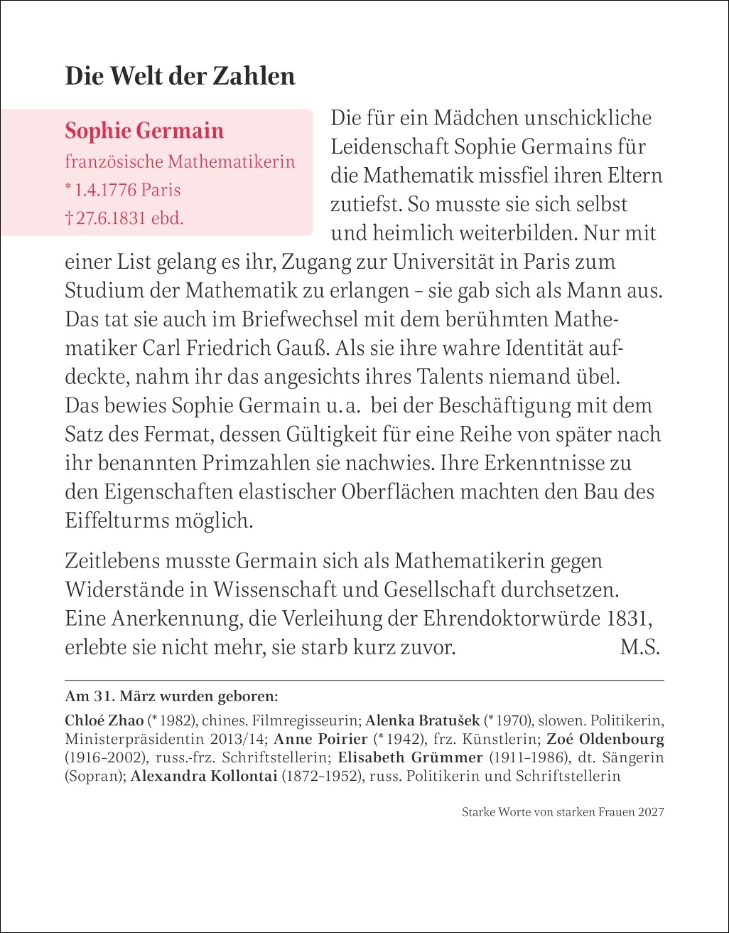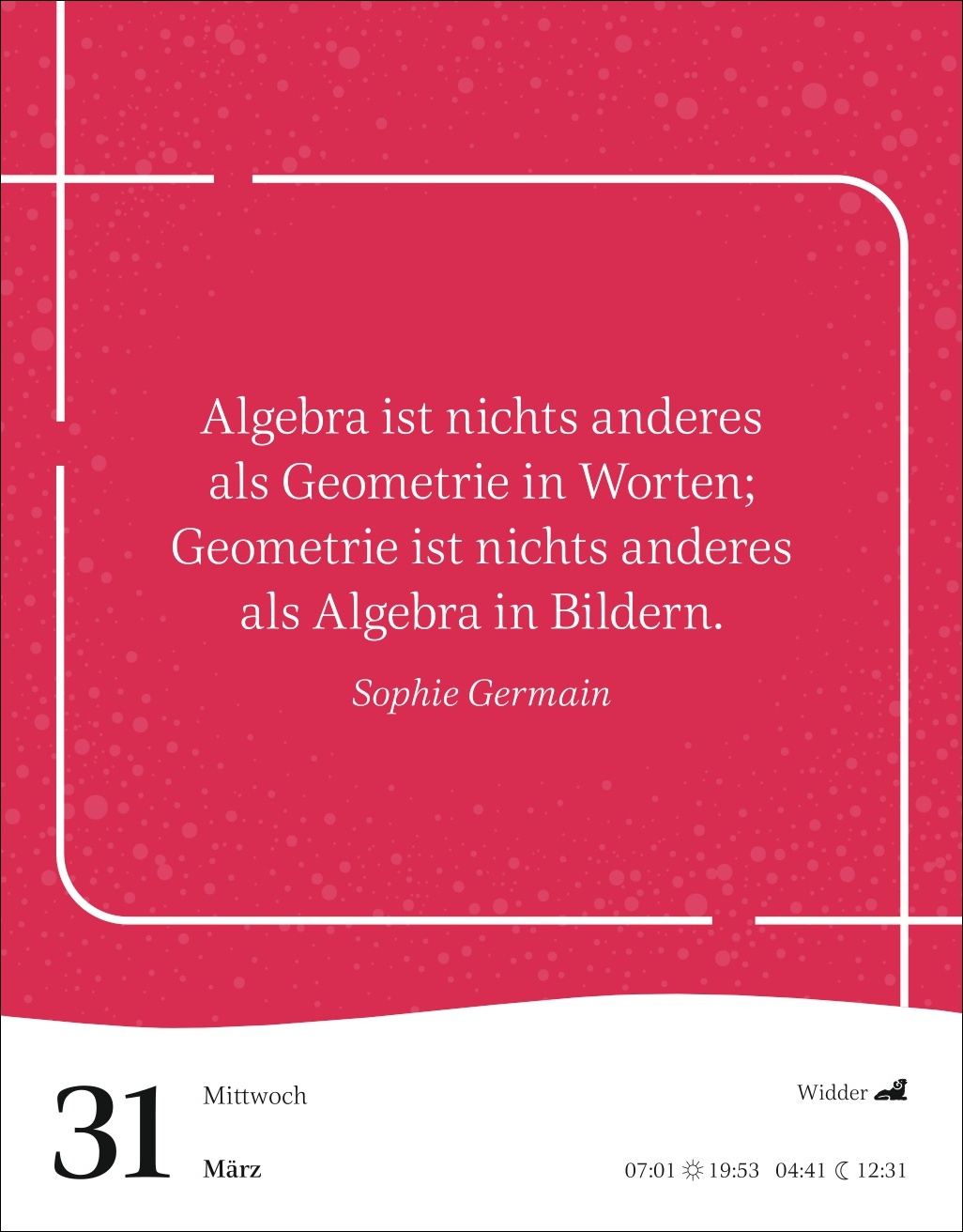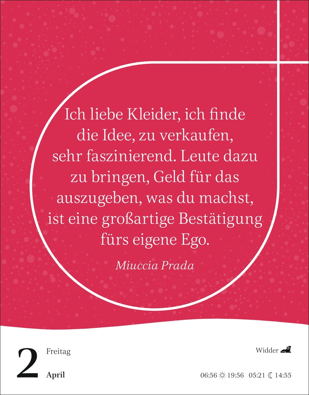- Von Elisabeth II. über Ferda Ataman, Margot Friedländer, Tsitsi Dangarembga, Emmy Noether, Özlem Türeci, Hypatia von Alexandria, Arundhati Roy bis Barbara Schöneberger und Santigold: Tischkalender mit klugen Weisheiten und scharfsinnigen Zitaten berühmter Frauen aus allen Epochen der Weltgeschichte