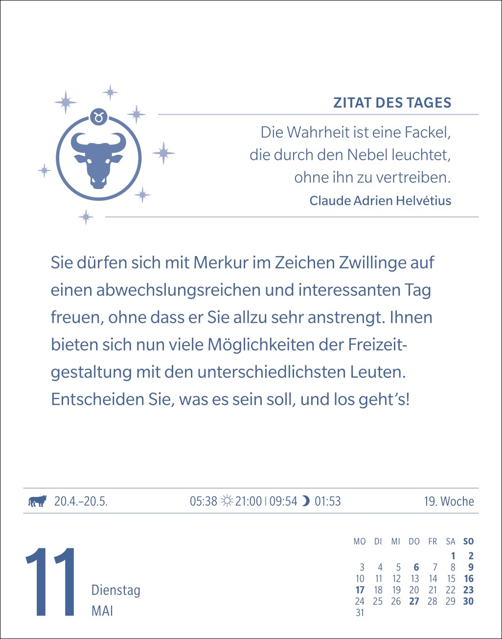 - Praktisches Design: Der kleine Aufstellkalender bietet ein übersichtliches Kalendarium mit einem Blatt für jeden Wochentag, Samstag und Sonntag auf einem gemeinsamen Blatt