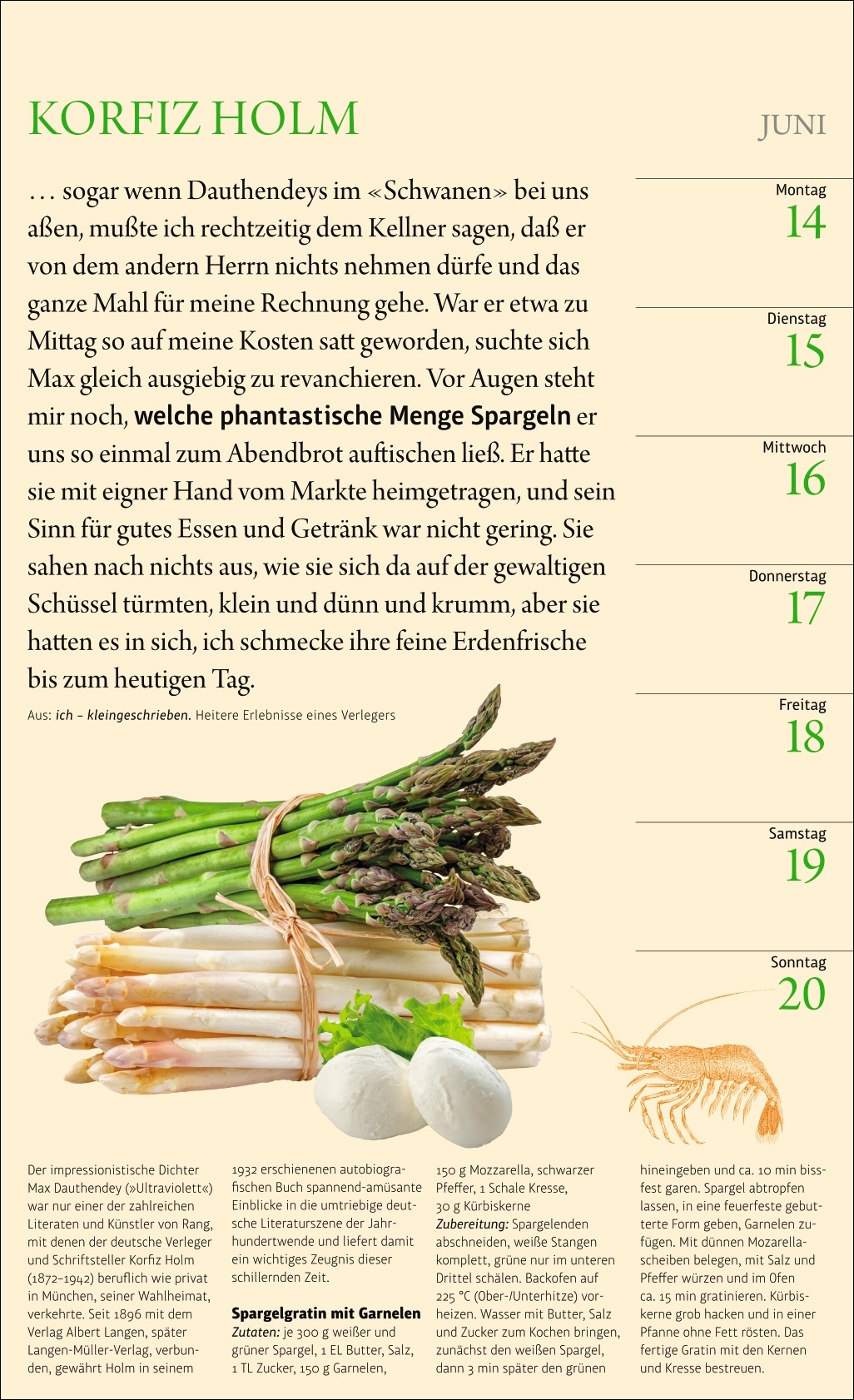 - Ein Muss für Literatur- und Kochfans: Mit seinen Zitaten aus der zeitgenössischen internationalen Literatur, aus klassischen Werken oder beliebten Krimis, den kenntnisreichen Anmerkungen der Herausgeberinnen und deren köstlichen Rezepten begeistert der Kalender nicht nur Hobbyköche, sondern auch passionierte Leser.