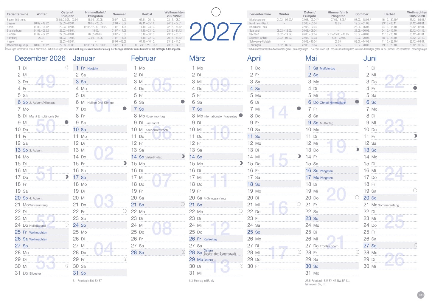- Für den schnellen Überblick: Kalender 2027 mit Schulferien und genügend Platz für Eintragungen