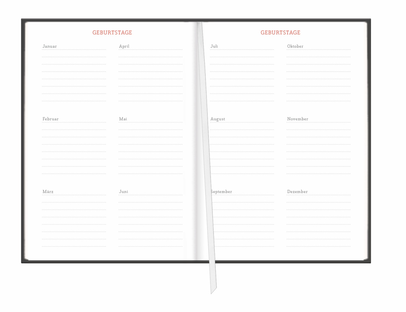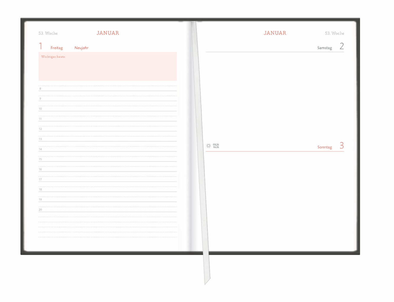 • Neutraler Organizer, der’s in sich hat: Terminplaner mit Lesebändchen, Gummiverschlussband, To-do-Listen und Adressbuch