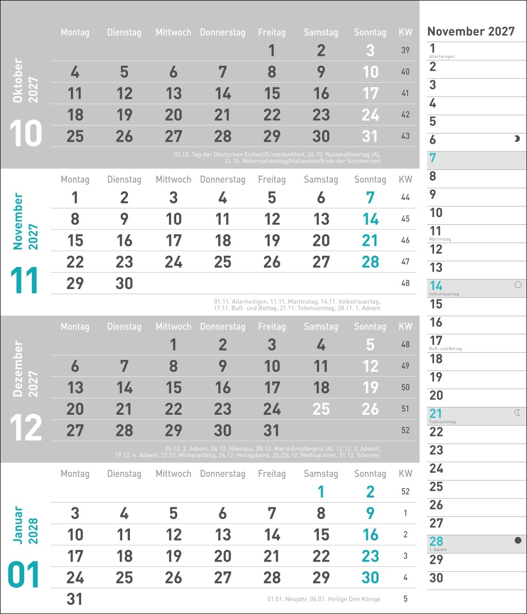 - Organisationshilfe für Büro und Homeoffice mit Jahresübersicht und farblich abgesetzten Wochenenden und Feiertagen in Türkis