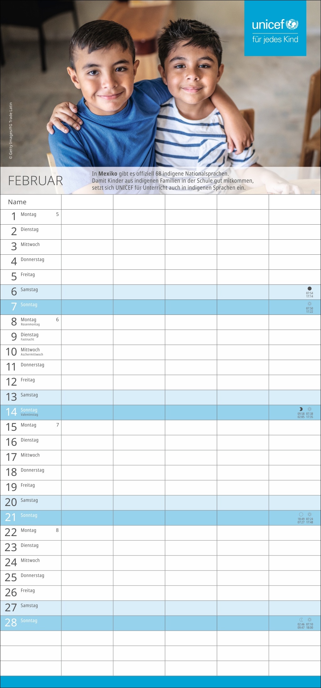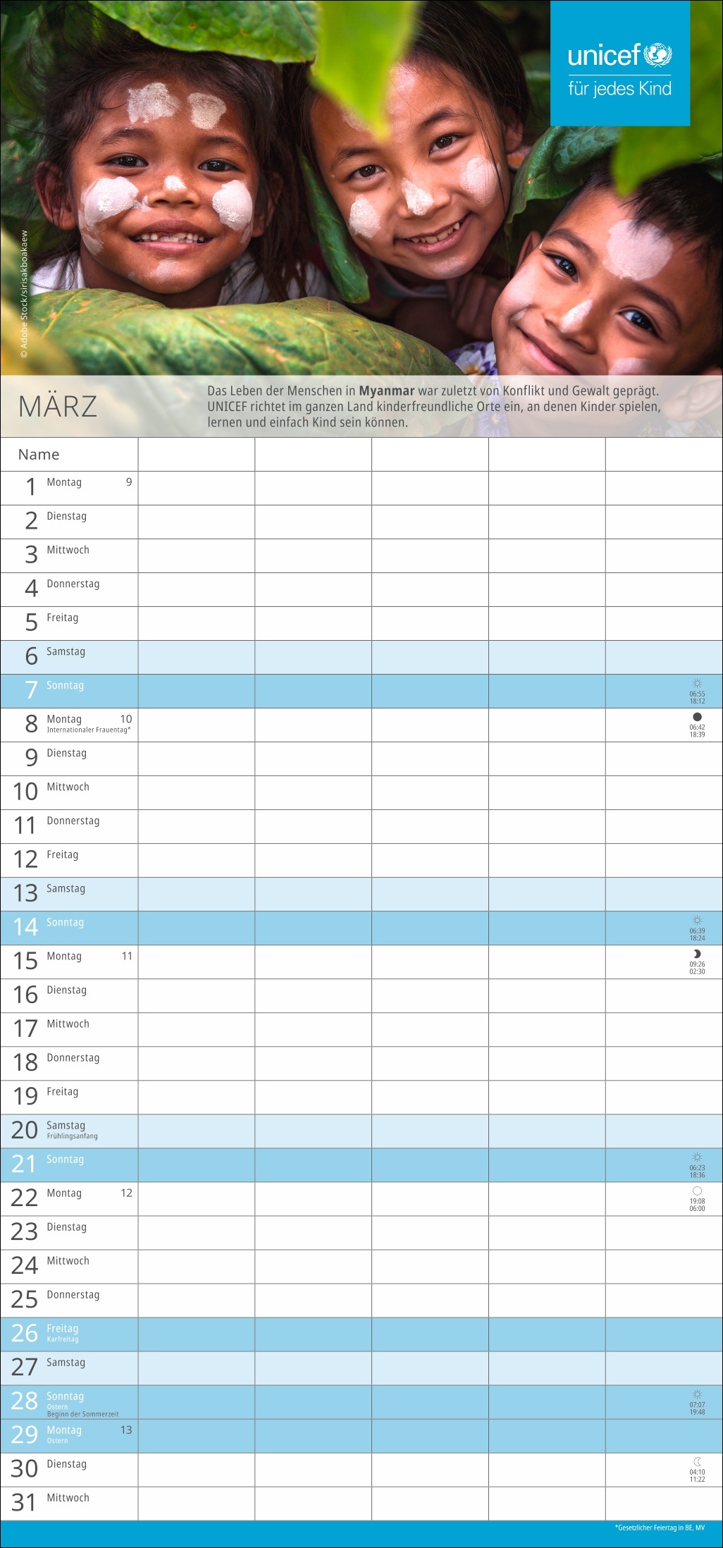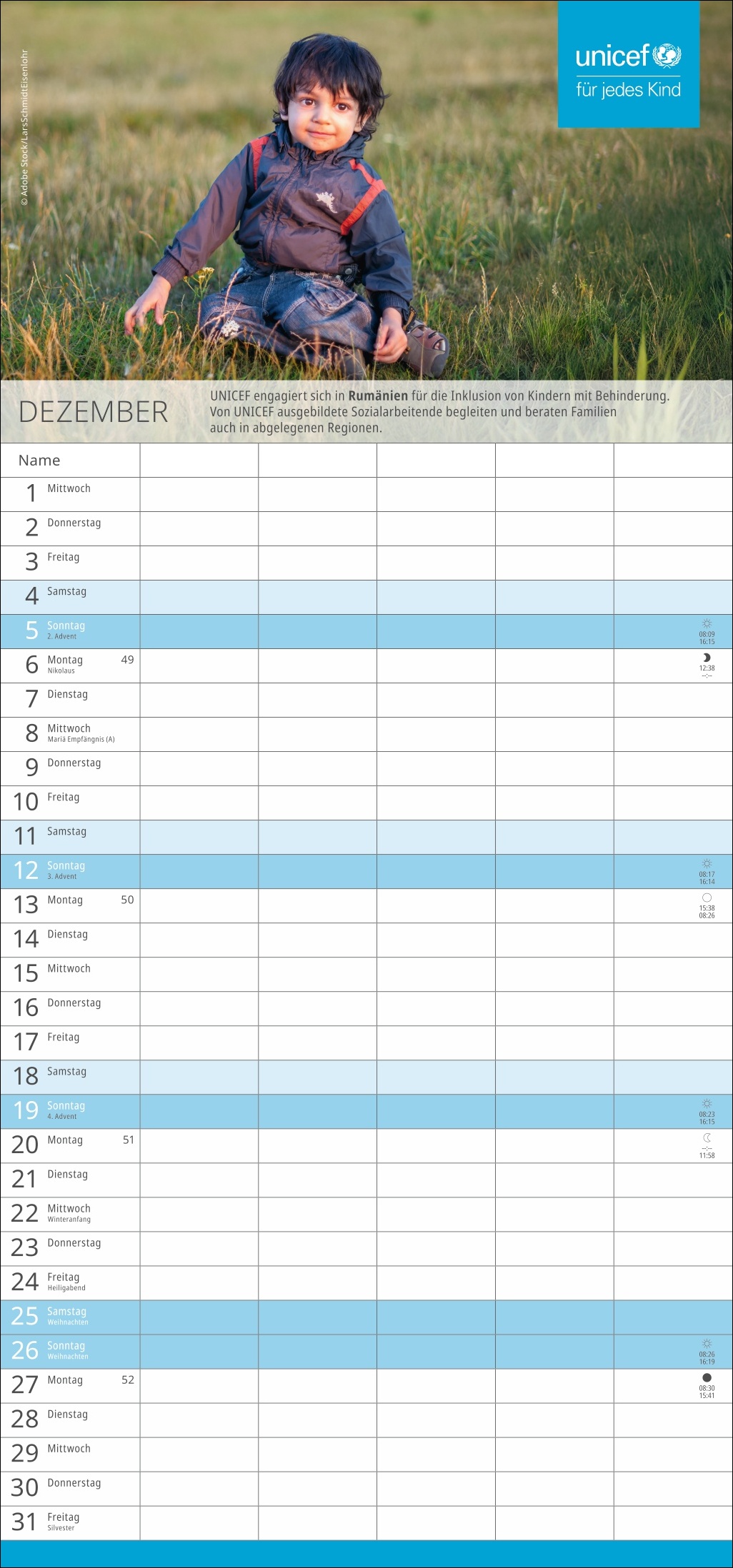 - Spenden Sie Hoffnung: Mit dem Kauf des Familien-Wandkalenders unterstützen Sie UNICEF und damit humanitäre Hilfe in über 190 Ländern