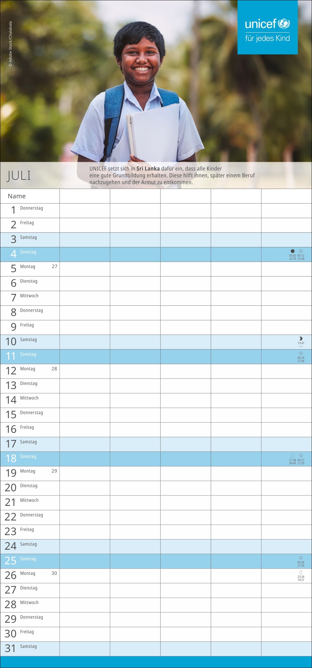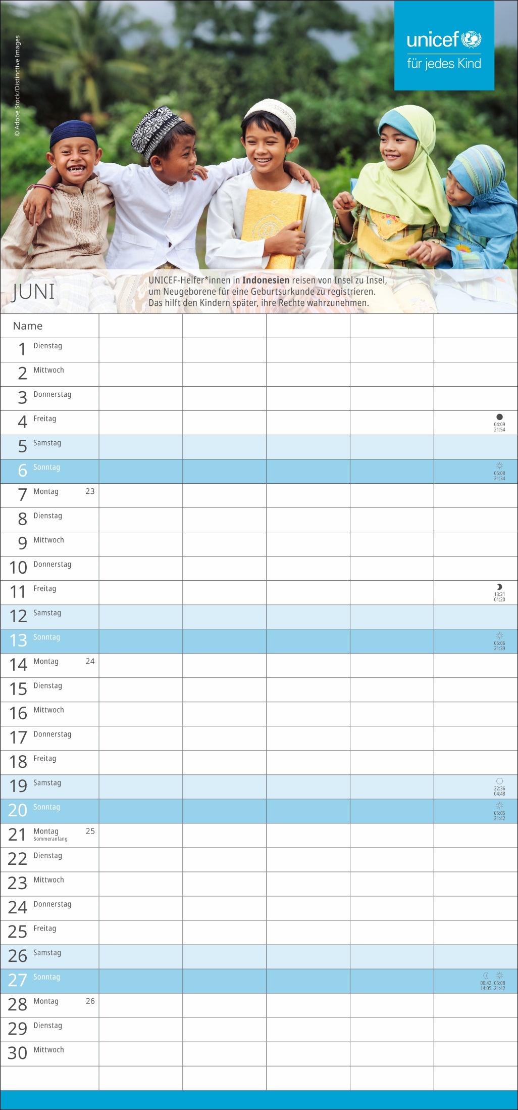 - Die nützliche Organisationshilfe, um Licht im Termin-Dschungel zu schaffen: Der fünfspaltige Familienkalender des Kinderhilfswerks der Vereinten Nationen