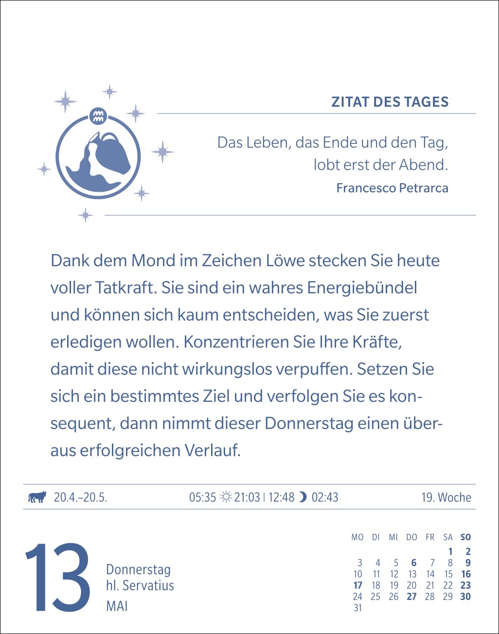 - Praktisches Design: Der kleine Aufstellkalender bietet ein übersichtliches Kalendarium mit einem Blatt für jeden Wochentag, Samstag und Sonntag auf einem gemeinsamen Blatt