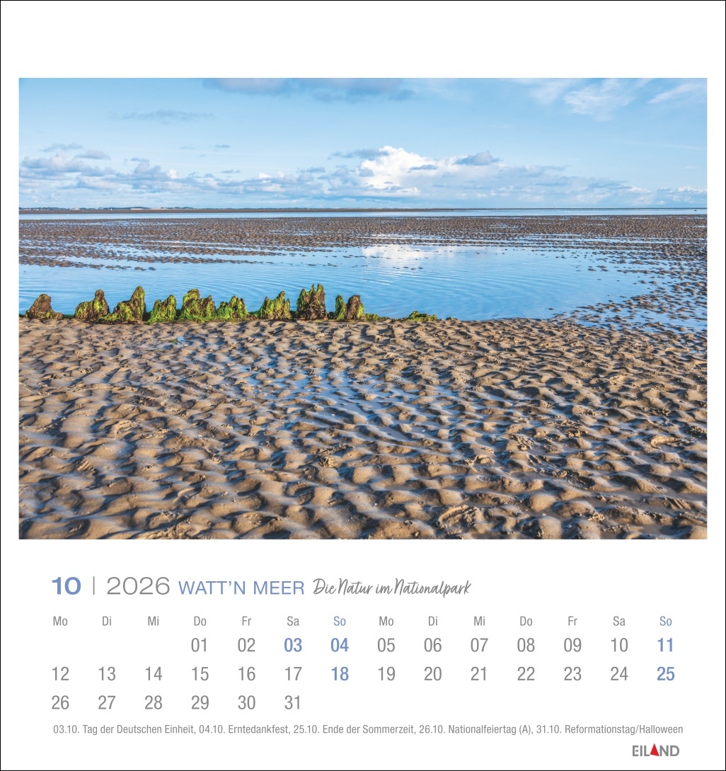- Dieser Eiland-Postkartenkalender bietet einen Einblick in die Vielfalt der Natur im Nationalpark Wattenmeer. Salzwiesen, Pflanzen wie der Queller und der fotogene Austernfischer sind u.a. zu sehen.