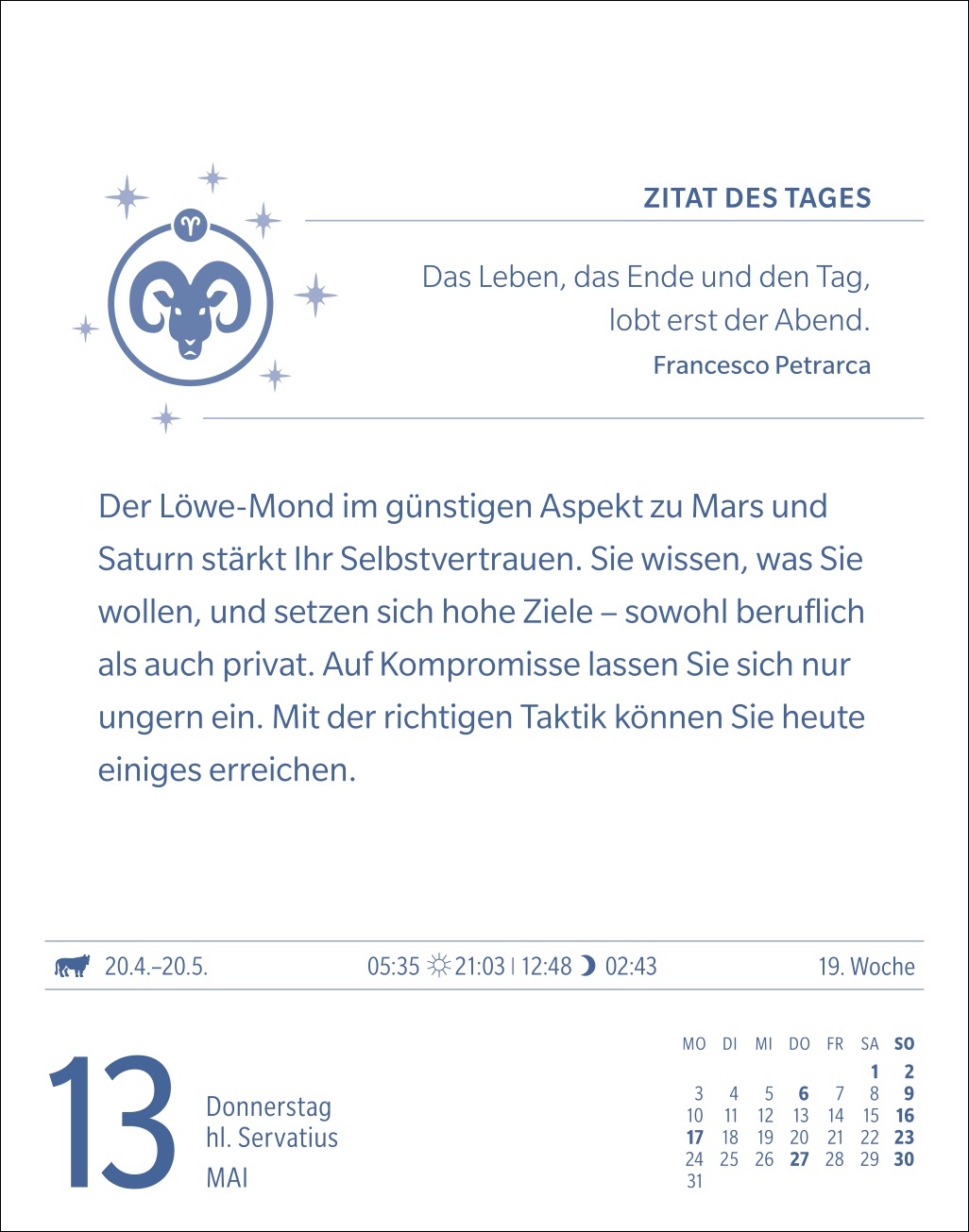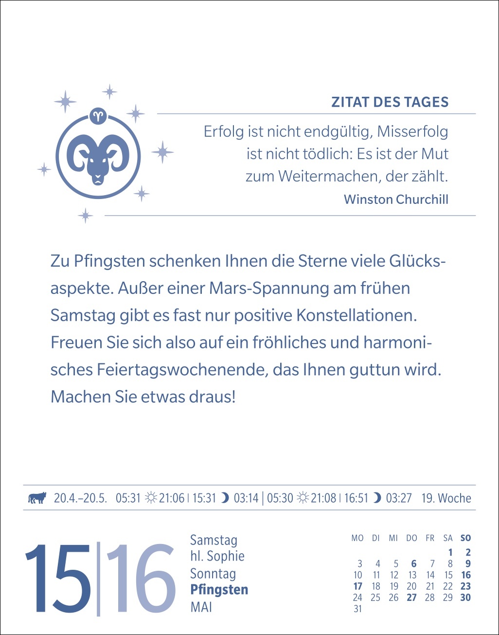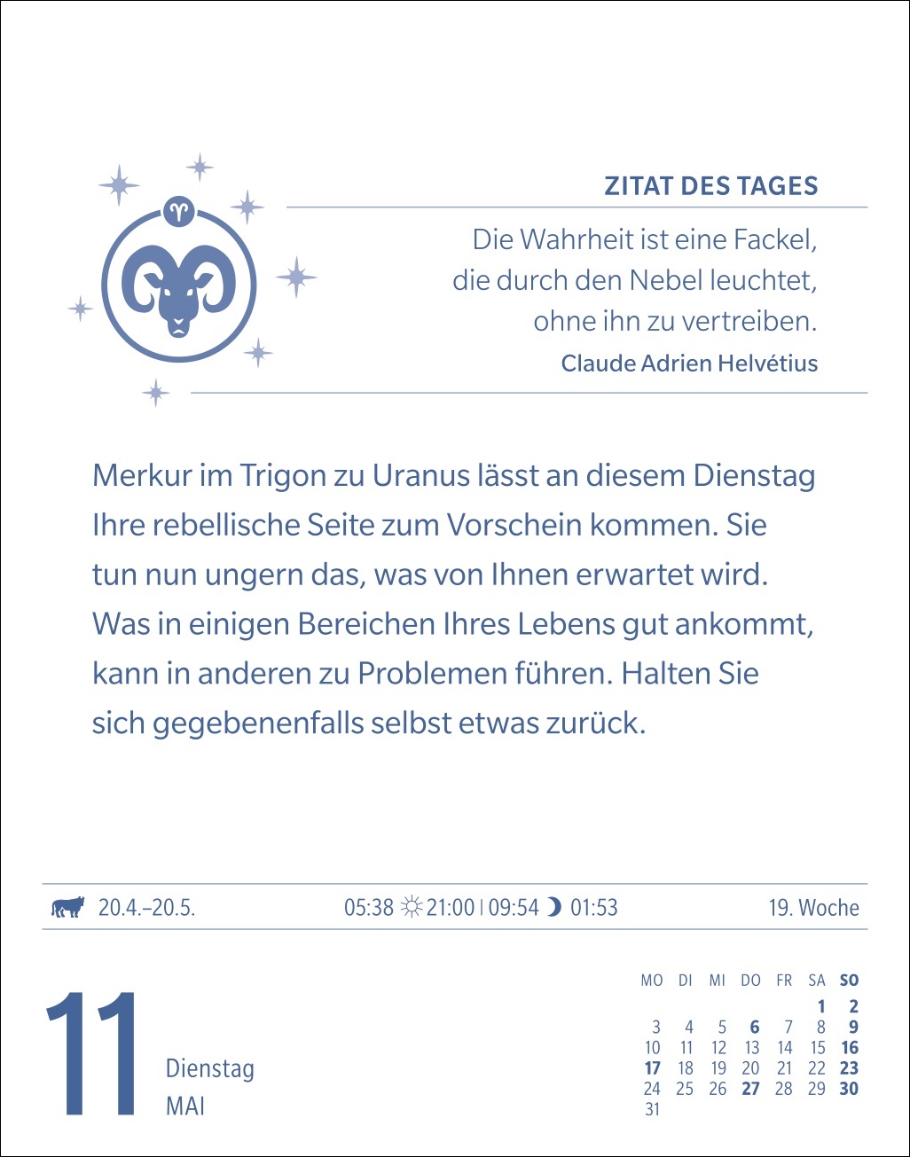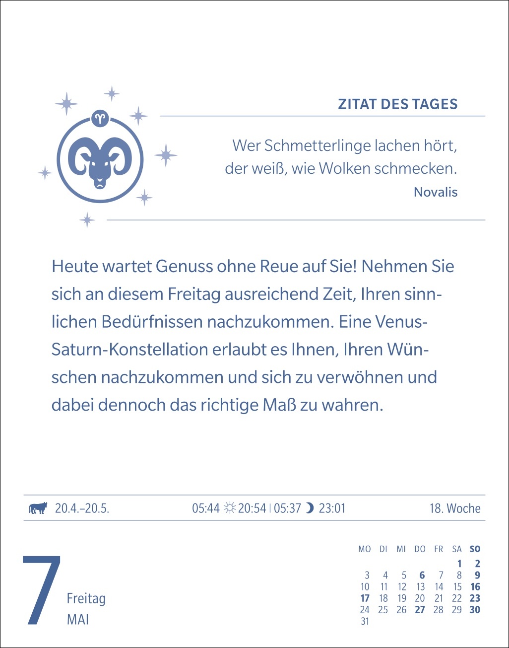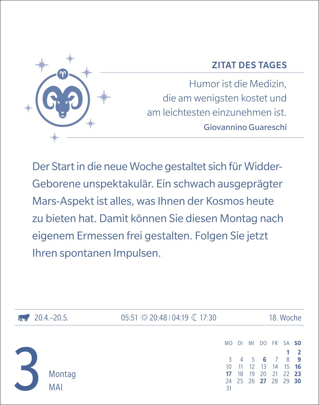 - Praktisches Design: Der kleine Aufstellkalender bietet ein übersichtliches Kalendarium mit einem Blatt für jeden Wochentag, Samstag und Sonntag auf einem gemeinsamen Blatt