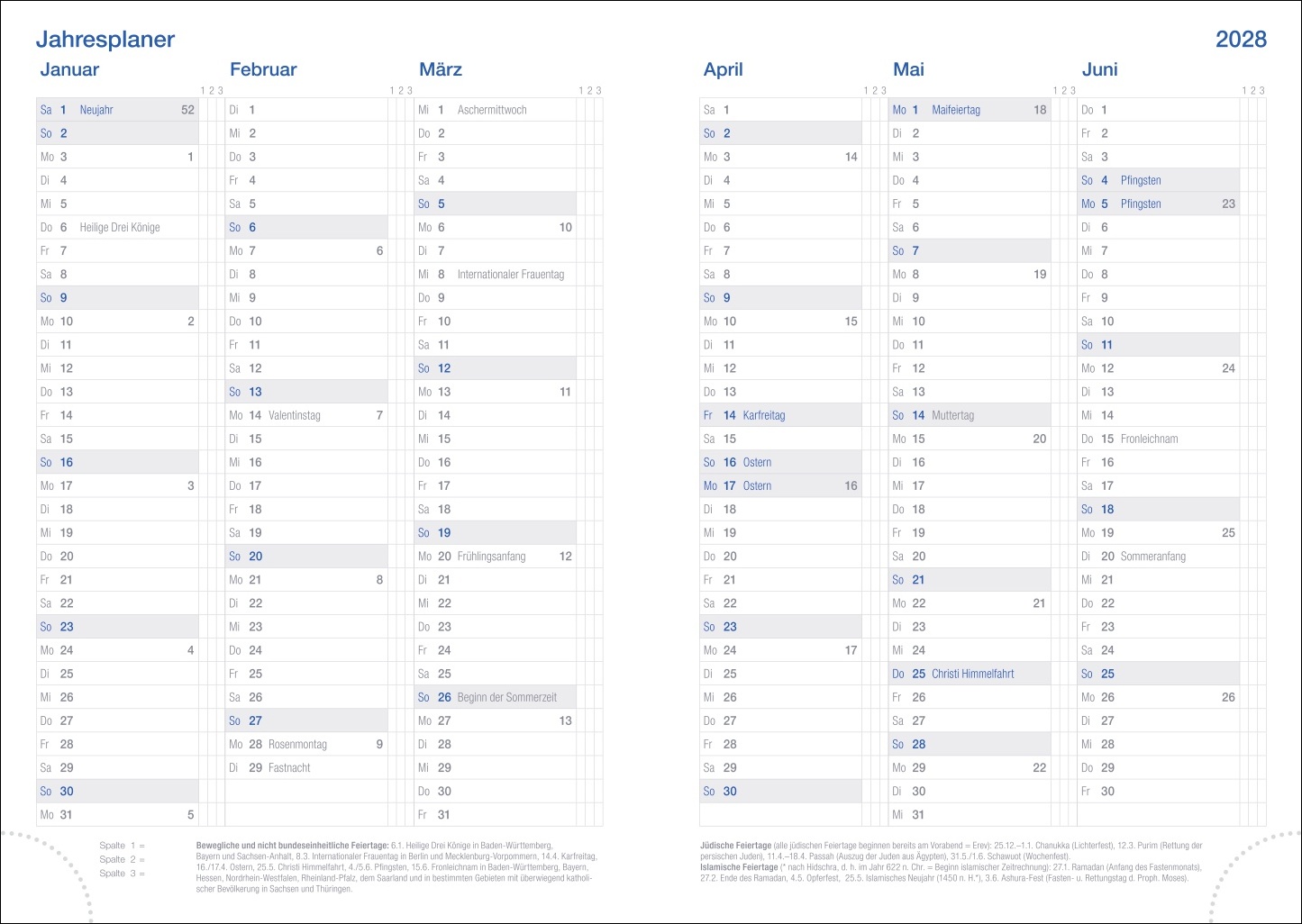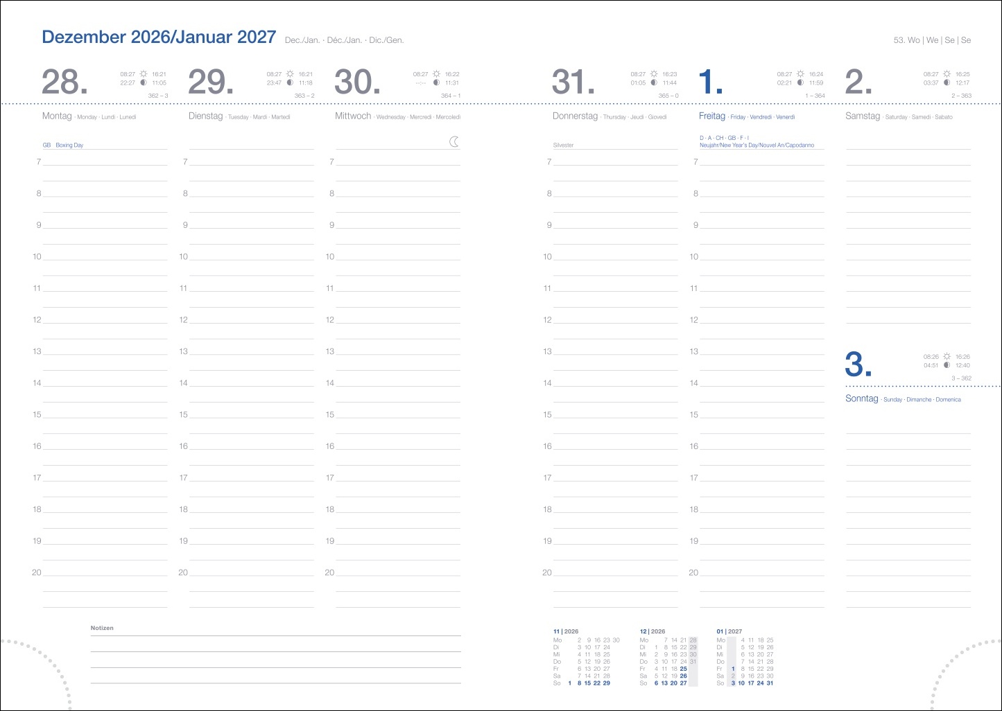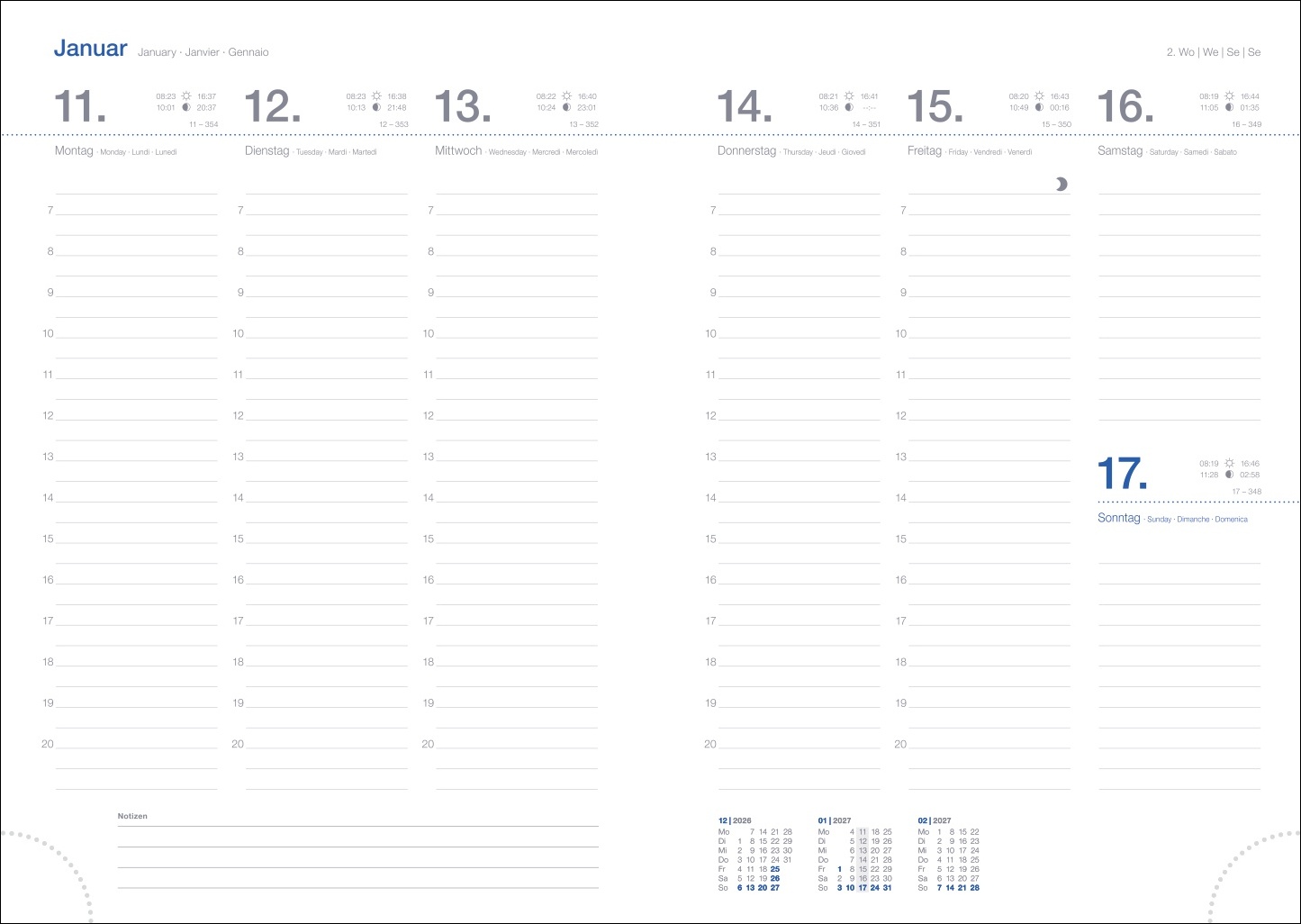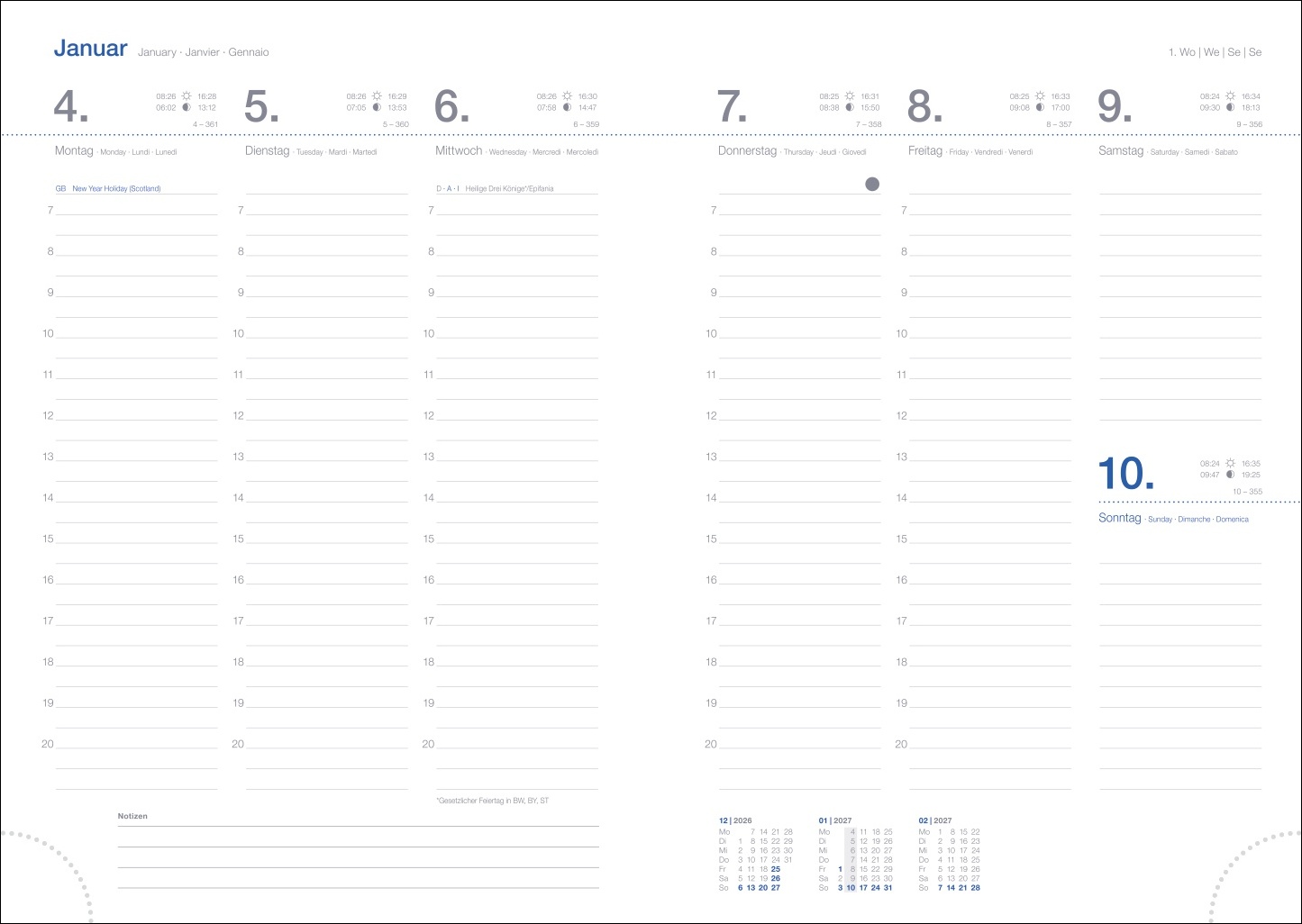 - Von Reiseplanung bis Zahnarzttermin: Der blaue Taschenplaner mit viersprachigem Kalendarium sorgt für Terminübersicht rund ums Jahr